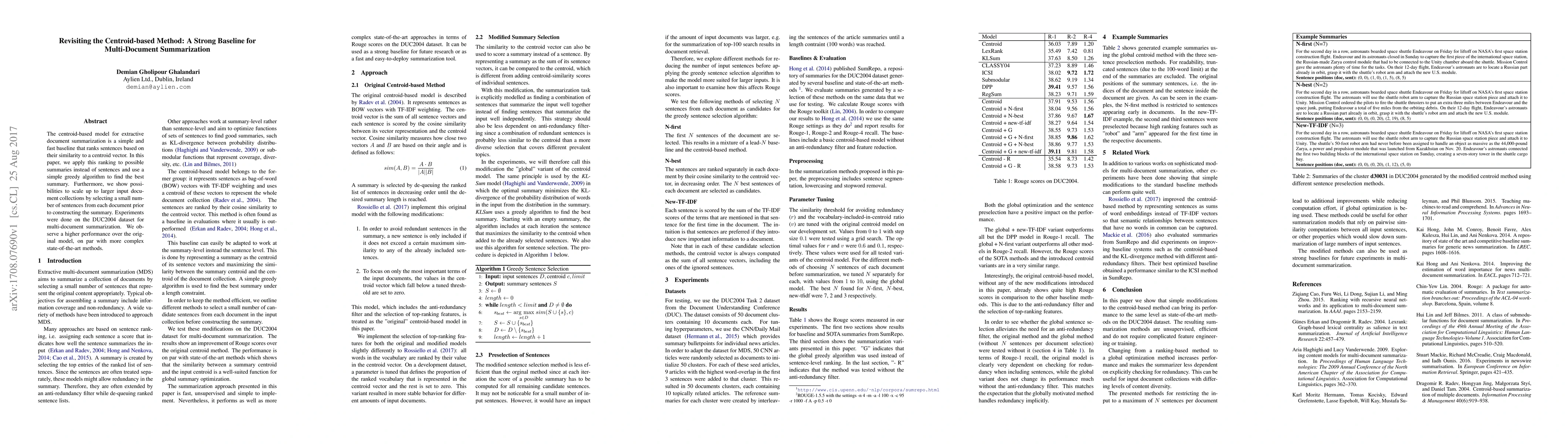 This paper revisits the centroid-based method for extractive summarization, applying it to rank possible summaries instead of individual sentences and employing a greedy algorithm to select the best summary. Experiments on the DUC2004 dataset show improved performance over the original model, comparable to more complex state-of-the-art techniques.