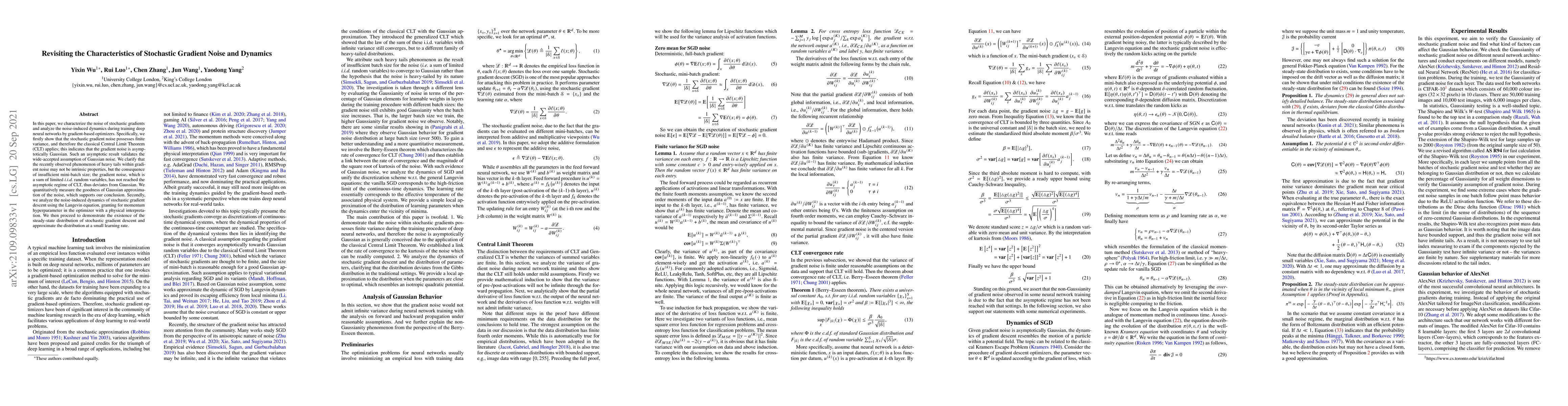 In this paper, we characterize the noise of stochastic gradients and analyze the noise-induced dynamics during training deep neural networks by gradient-based optimizers. Specifically, we firstly show that the stochastic gradient noise possesses finite variance, and therefore the classical Central Limit Theorem (CLT) applies; this indicates that the gradient noise is asymptotically Gaussian. Such an asymptotic result validates the wide-accepted assumption of Gaussian noise. We clarify that the recently observed phenomenon of heavy tails within gradient noise may not be intrinsic properties, but the consequence of insufficient mini-batch size; the gradient noise, which is a sum of limited i.i.d. random variables, has not reached the asymptotic regime of CLT, thus deviates from Gaussian. We quantitatively measure the goodness of Gaussian approximation of the noise, which supports our conclusion. Secondly, we analyze the noise-induced dynamics of stochastic gradient descent using the Langevin equation, granting for momentum hyperparameter in the optimizer with a physical interpretation. We then proceed to demonstrate the existence of the steady-state distribution of stochastic gradient descent and approximate the distribution at a small learning rate.