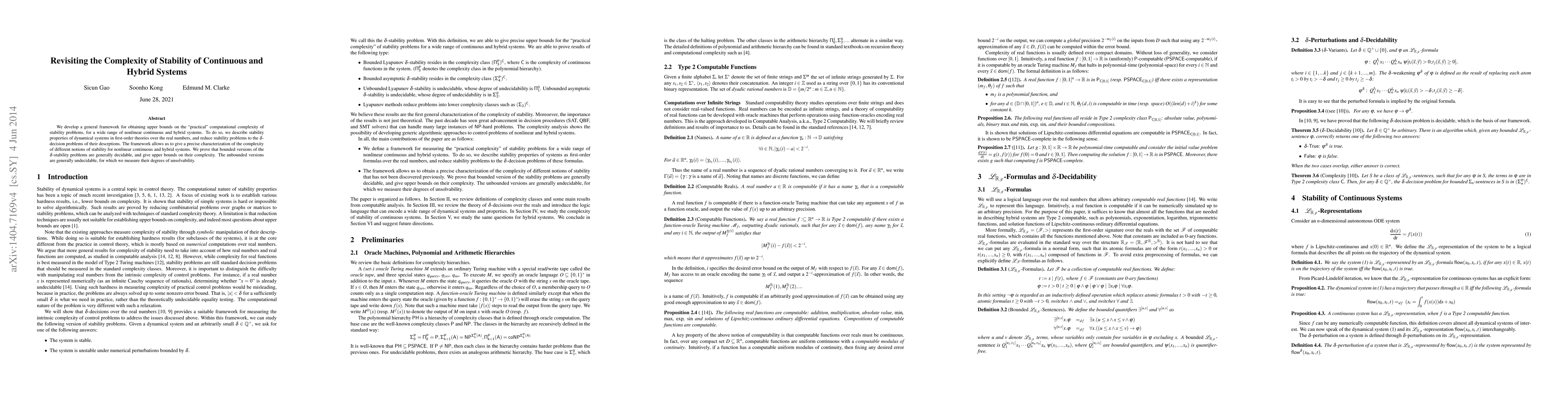 This paper develops a framework to determine the computational complexity of stability problems for nonlinear continuous and hybrid systems, showing that bounded versions are decidable while unbounded versions are generally undecidable, with specified upper bounds on their degrees of unsolvability.