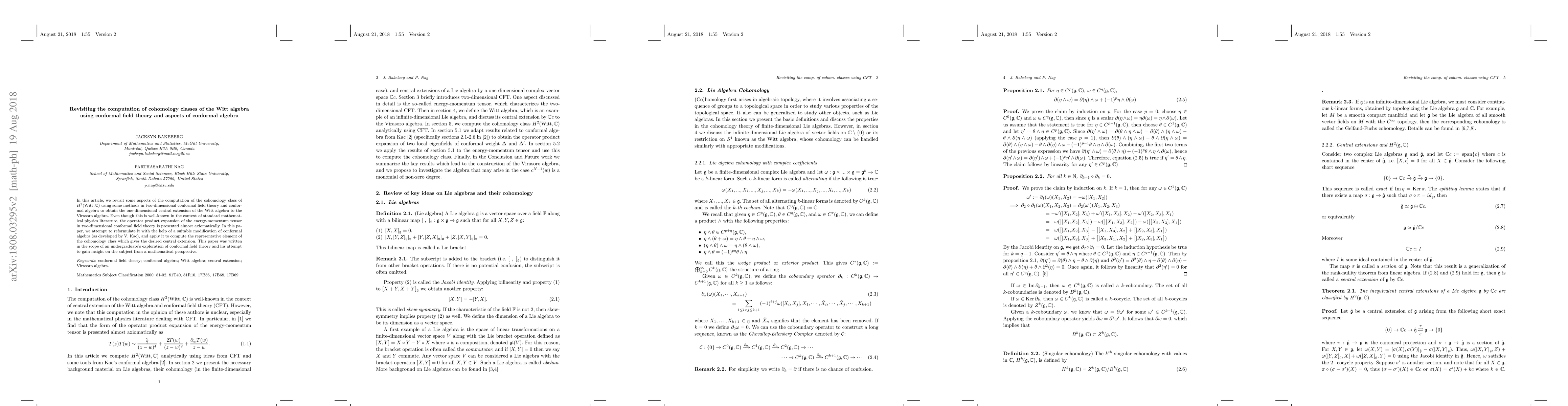This paper revisits the computation of the second cohomology class of the Witt algebra using conformal field theory and conformal algebra, aiming to derive the one-dimensional central extension to the Virasoro algebra. The author reformulates the operator product expansion of the energy-momentum tensor with a modified approach from conformal algebra to achieve this.