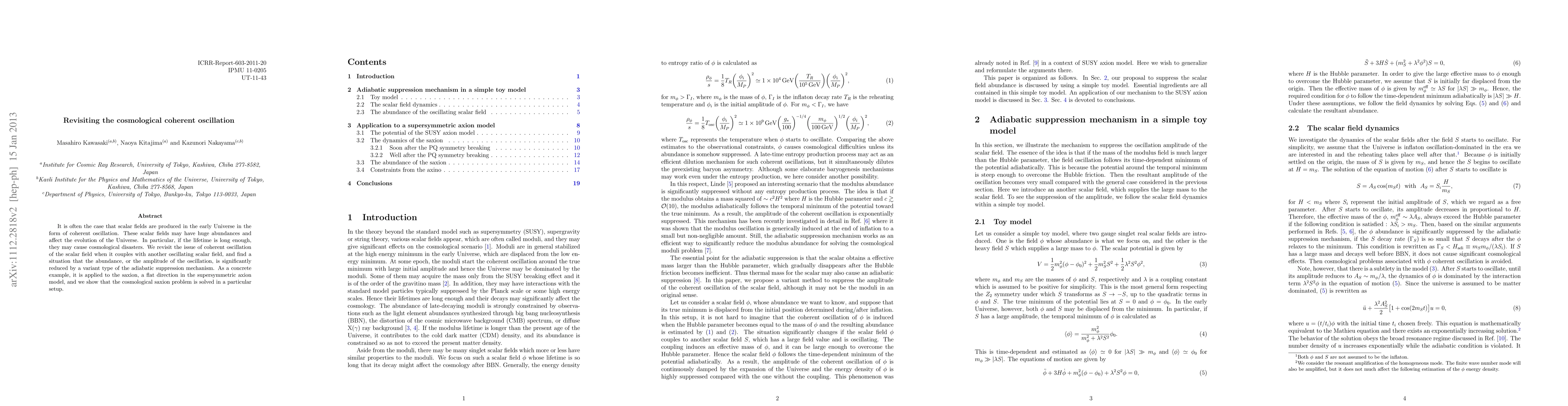 This paper examines the coherent oscillation of scalar fields in the early Universe, showing that coupling with another oscillating scalar field can significantly reduce the amplitude of these oscillations through an adiabatic suppression mechanism. This approach resolves the cosmological saxion problem in the supersymmetric axion model.