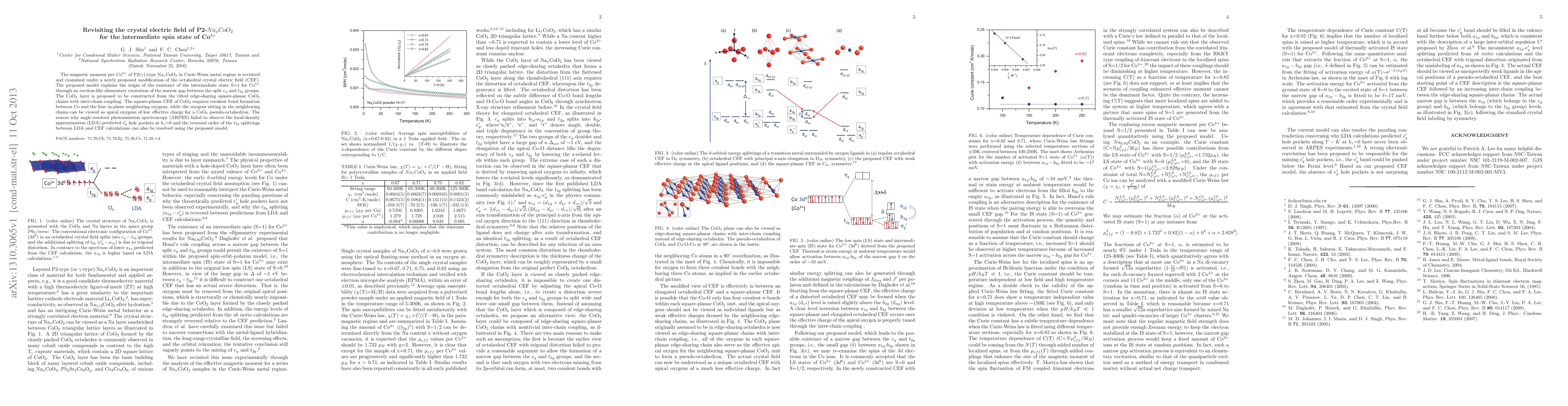 The magnetic moment per Co4+ of P2(gamma)-type NaxCoO2 in Curie-Weiss metal regime is revisited and examined under a newly proposed modification of the octahedral crystal electric field (CEF). The proposed model explains the origin of the existence of the intermediate state S=1 for Co3+ through an exciton-like elementary excitation of the narrow gap between the split eg and t2g groups. The CoO2 layer is proposed to be constructed from the tilted edge-sharing square-planar CoO2 chains with inter-chain coupling. The square-planar CEF of CoO2 requires covalent bond formation between Co and the four in-plane neighboring oxygens, while the oxygens sitting in the neighboring chains can be viewed as apical oxygens of low effective charge for a CoO6 pseudo-octahedron. The reason why angle-resolved photoemission spectroscopy (ARPES) failed to observe the local-density approximation (LDA) predicted e'g hole pockets at kz=0 and the reversed order of the t2g splittings between LDA and CEF calculations can also be resolved using the proposed model.