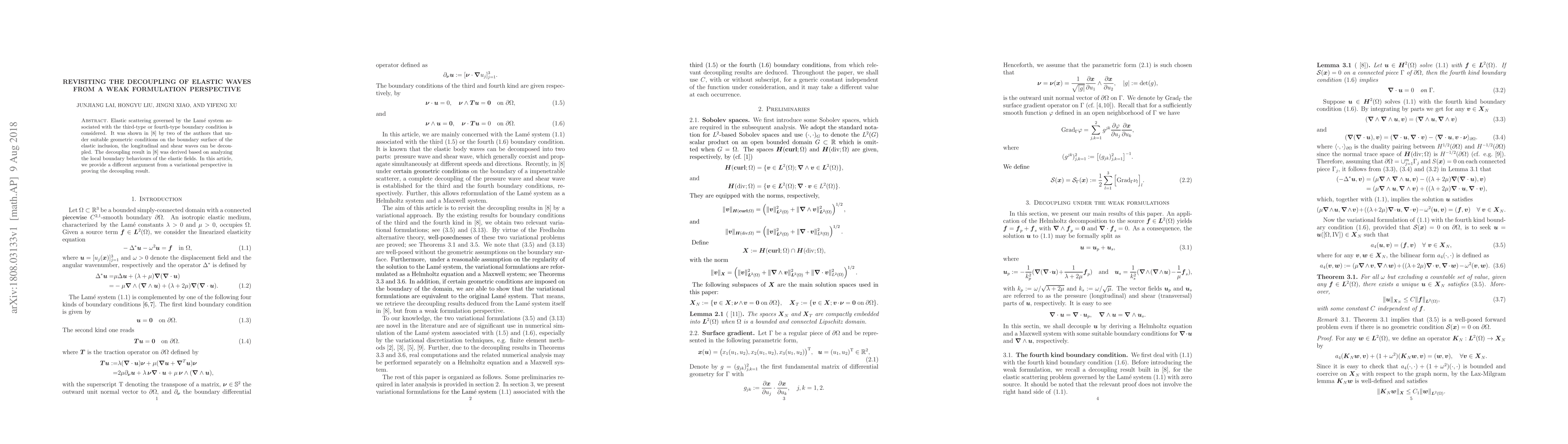 Elastic scattering governed by the Lame system associated with the third-type or fourth-type boundary condition is considered. It was shown in [8] by two of the authors that under suitable geometric conditions on the boundary surface of the elastic inclusion, the longitudinal and shear waves can be decoupled. The decoupling result in [8] was derived based on analyzing the local boundary behaviours of the elastic fields. In this article, we provide a different argument from a variational perspective in proving the decoupling result.
