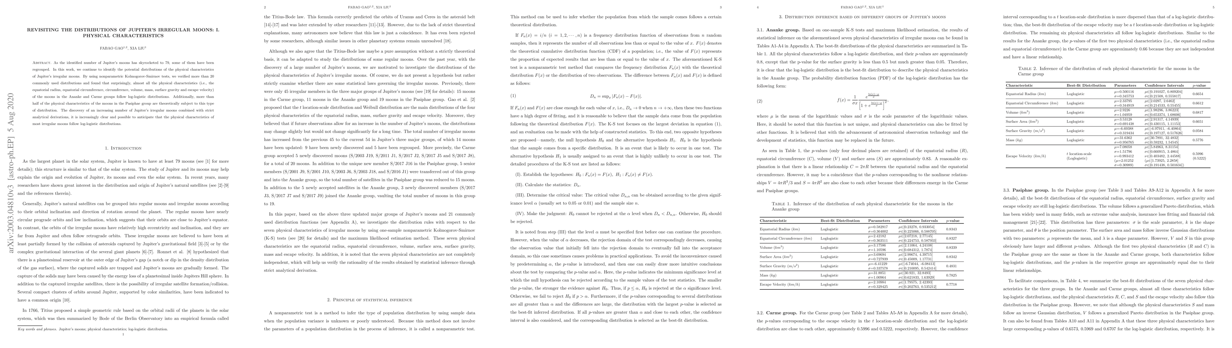 This study reevaluates Jupiter's irregular moon characteristics, finding that most physical attributes follow log-logistic distributions. Using Kolmogorov-Smirnov tests, the research confirms this trend for Ananke and Carme groups, and suggests it for the Pasiphae group.