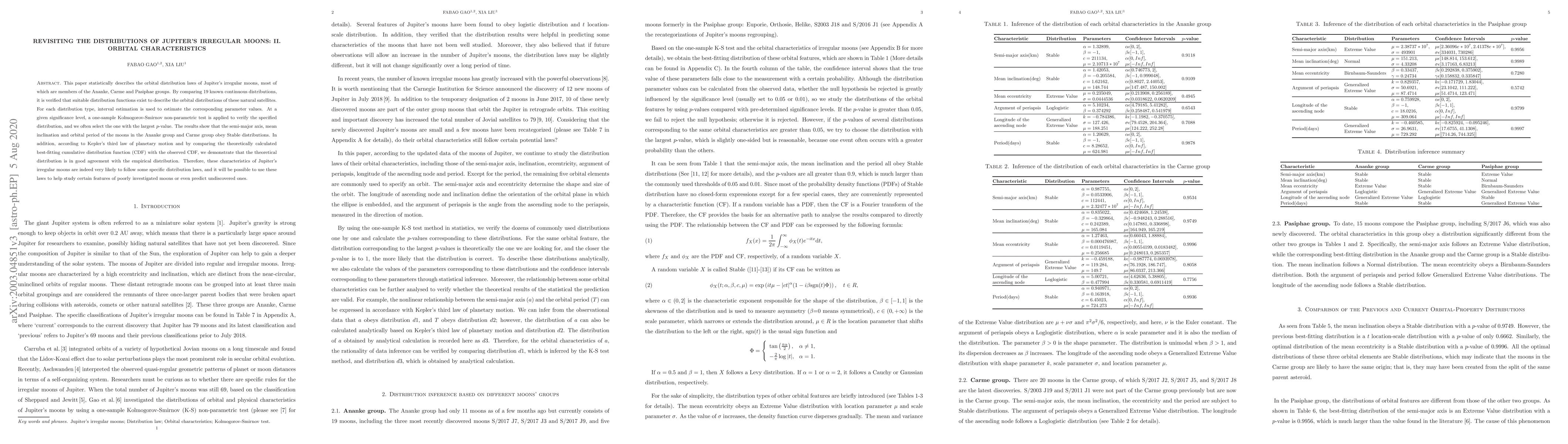 This paper statistically describes the orbital distribution laws of Jupiter's irregular moons, most of which are members of the Ananke, Carme and Pasiphae groups. By comparing 19 known continuous distributions, it is verified that suitable distribution functions exist to describe the orbital distributions of these natural satellites. For each distribution type, interval estimation is used to estimate the corresponding parameter values. At a given significance level, a one-sample Kolmogorov-Smirnov non-parametric test is applied to verify the specified distribution, and we often select the one with the largest $p$-value. The results show that the semi-major axis, mean inclination and orbital period of the moons in the Ananke group and Carme group obey Stable distributions. In addition, according to Kepler's third law of planetary motion and by comparing the theoretically calculated best-fitting cumulative distribution function (CDF) with the observed CDF, we demonstrate that the theoretical distribution is in good agreement with the empirical distribution. Therefore, these characteristics of Jupiter's irregular moons are indeed very likely to follow some specific distribution laws, and it will be possible to use these laws to help study certain features of poorly investigated moons or even predict undiscovered ones.