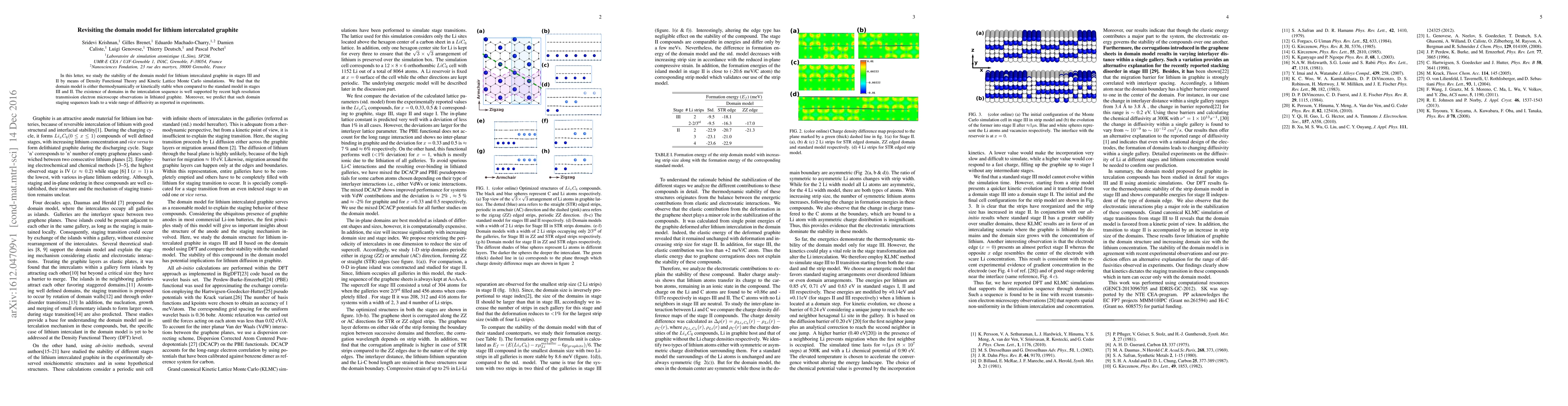 This paper investigates the stability of the domain model for lithium intercalated graphite using Density Functional Theory and Kinetic Lattice Monte Carlo simulations, finding it to be thermodynamically or kinetically stable compared to the standard model. High resolution electron microscopy supports the existence of these domains, which also correlate with experimental diffusivity ranges.
