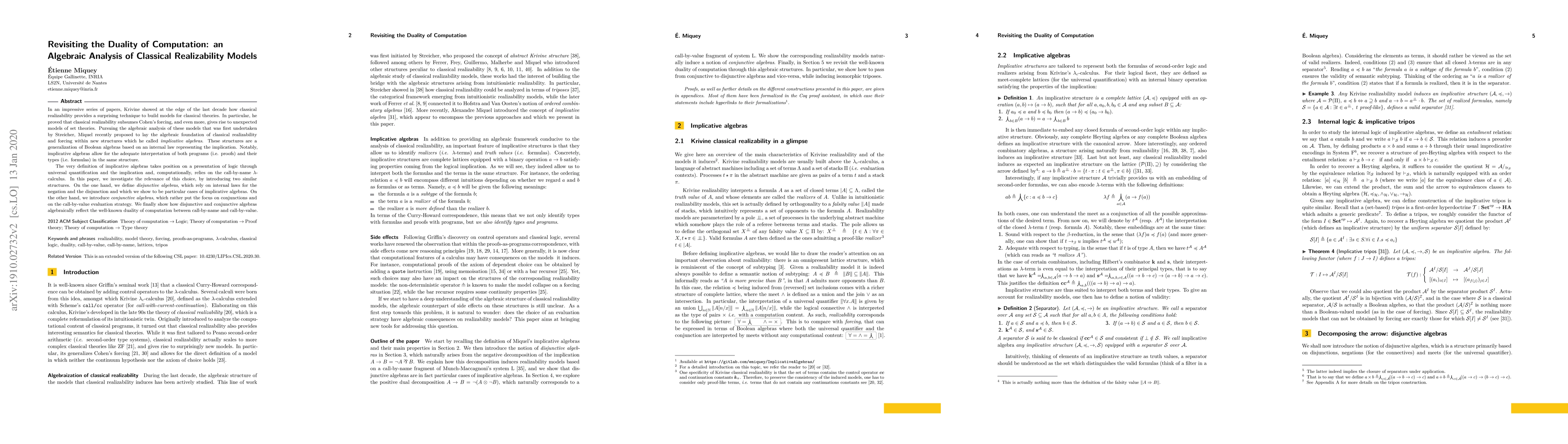 This paper explores the algebraic foundations of classical realizability and forcing, proposing new structures called implicative, disjunctive, and conjunctive algebras. It investigates how these structures reflect the duality of computation between call-by-name and call-by-value evaluation strategies.
