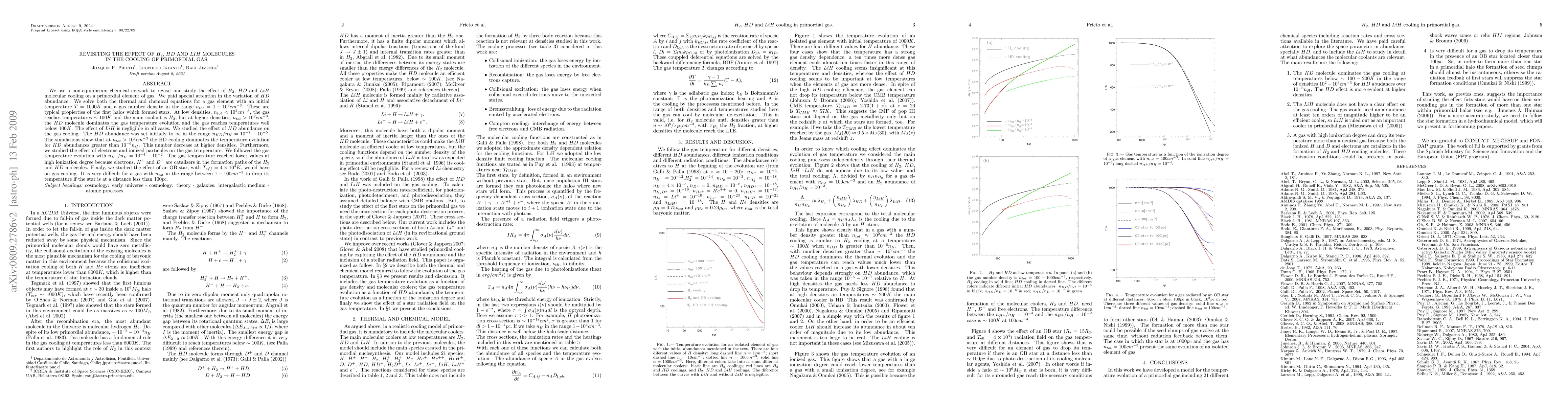 This paper examines the cooling of primordial gas influenced by H₂, HD, and LiH molecules using a non-equilibrium chemical network. At low densities, H₂ is the primary coolant, while HD dominates at higher densities, especially when deuterium abundance exceeds 10⁻⁵nₕ. The study also finds that gas temperature is lower at higher ionization degrees due to the catalytic role of electrons and ions in forming cooling molecules. Lastly, it concludes that an OB star can hinder gas cooling if it is within 100 pc of gas densities between 1-100 cm⁻³.