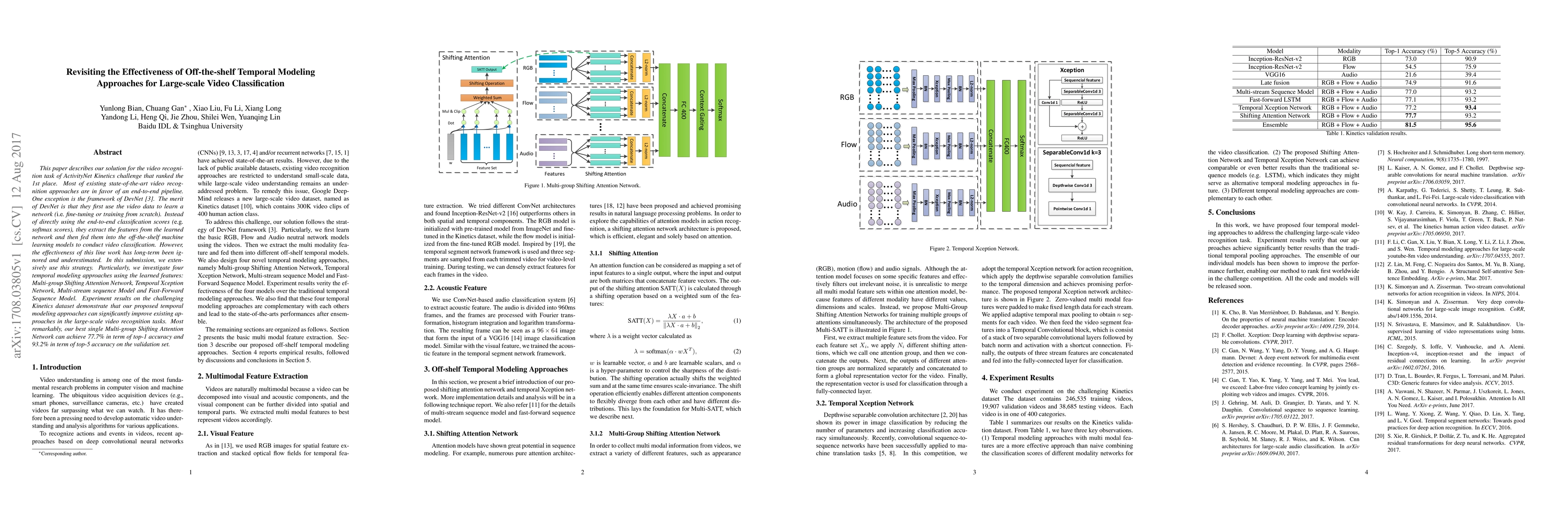 This paper describes our solution for the video recognition task of ActivityNet Kinetics challenge that ranked the 1st place. Most of existing state-of-the-art video recognition approaches are in favor of an end-to-end pipeline. One exception is the framework of DevNet. The merit of DevNet is that they first use the video data to learn a network (i.e. fine-tuning or training from scratch). Instead of directly using the end-to-end classification scores (e.g. softmax scores), they extract the features from the learned network and then fed them into the off-the-shelf machine learning models to conduct video classification. However, the effectiveness of this line work has long-term been ignored and underestimated. In this submission, we extensively use this strategy. Particularly, we investigate four temporal modeling approaches using the learned features: Multi-group Shifting Attention Network, Temporal Xception Network, Multi-stream sequence Model and Fast-Forward Sequence Model. Experiment results on the challenging Kinetics dataset demonstrate that our proposed temporal modeling approaches can significantly improve existing approaches in the large-scale video recognition tasks. Most remarkably, our best single Multi-group Shifting Attention Network can achieve 77.7% in term of top-1 accuracy and 93.2% in term of top-5 accuracy on the validation set.
