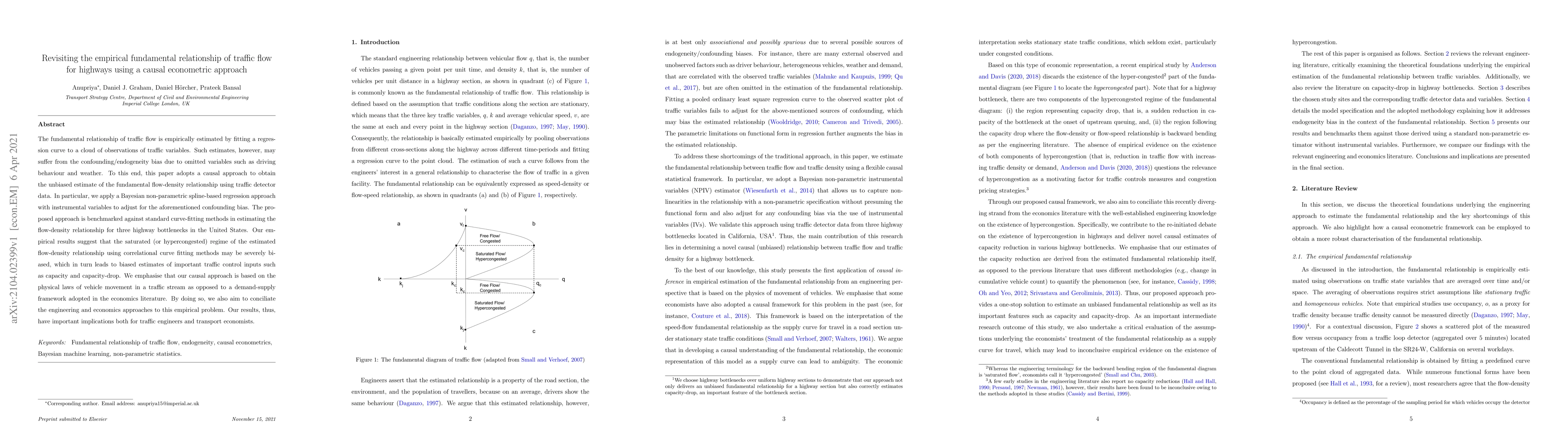 This paper proposes a causal econometric approach using Bayesian non-parametric spline-based regression with instrumental variables to obtain unbiased estimates of traffic flow-density relationships, addressing endogeneity issues. The results suggest that traditional correlational methods may severely bias the estimation of traffic control inputs, highlighting the importance of a causal approach grounded in physical laws of vehicle movement.