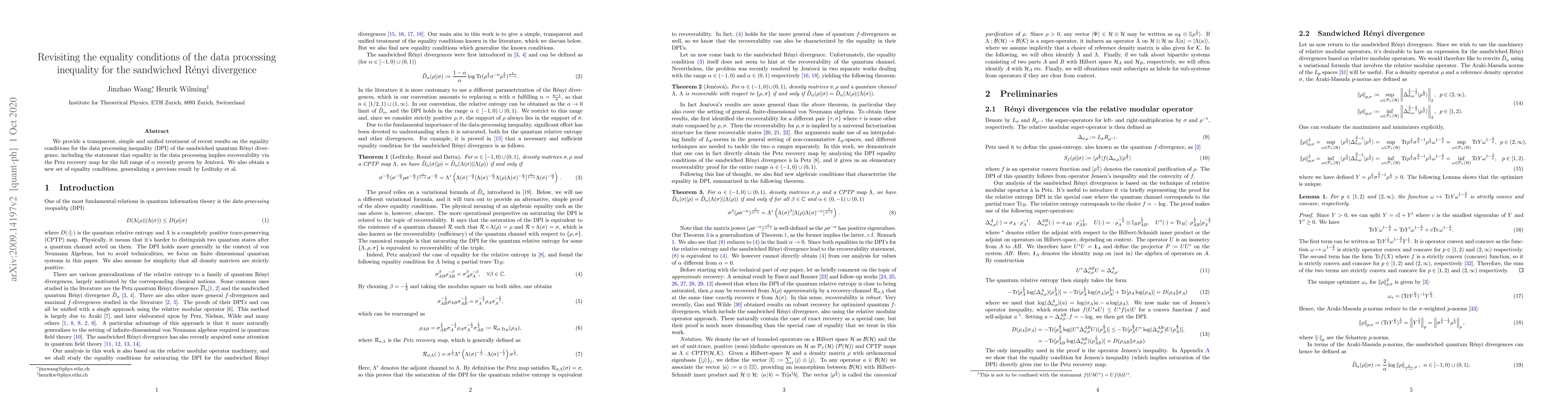 This paper revisits the equality conditions for the data processing inequality of the sandwiched quantum Rényi divergence, confirming that equality implies recoverability via the Petz recovery map for all $\alpha$, and presents a new set of generalized equality conditions.