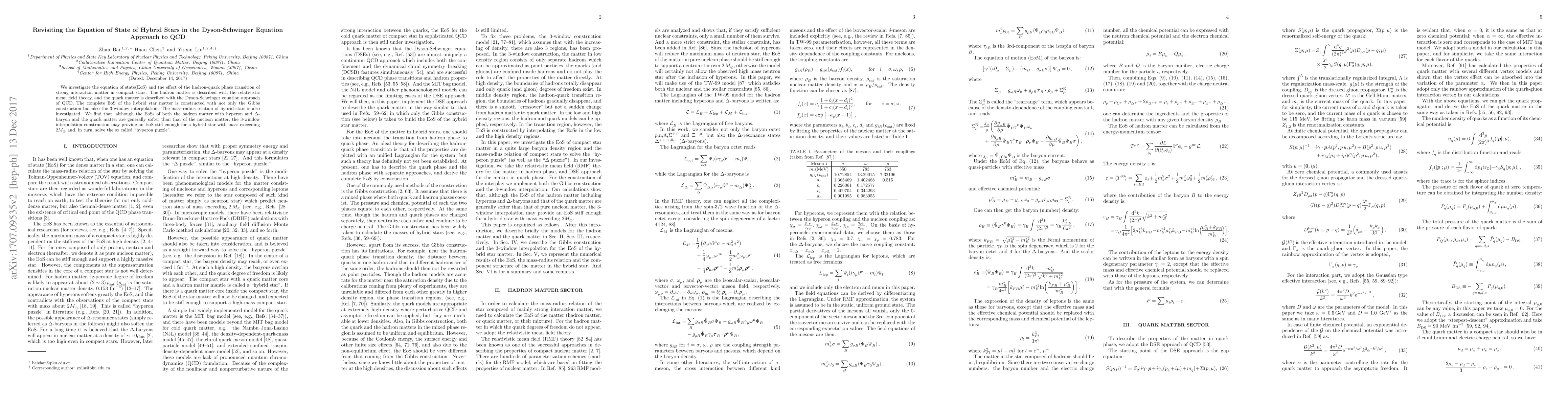 This paper examines the equation of state of hybrid stars using the Dyson-Schwinger equation approach for QCD quark matter and relativistic mean field theory for hadron matter. The study finds that a 3-window interpolation method can construct a sufficiently stiff equation of state for hybrid stars, potentially resolving the "hyperon puzzle" by supporting stars with masses over 2 solar masses.