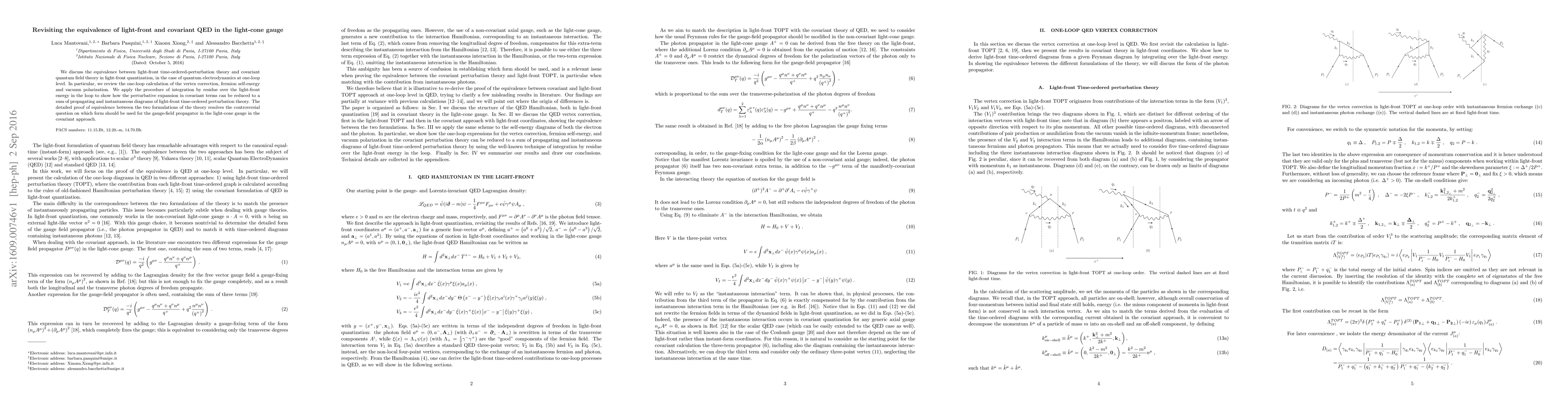 This paper investigates the equivalence of light-front and covariant QED in the light-cone gauge, demonstrating the reduction of one-loop perturbative expansions to a sum of light-front and instantaneous diagrams. The detailed proof resolves the debate over the appropriate gauge-field propagator in the covariant approach.