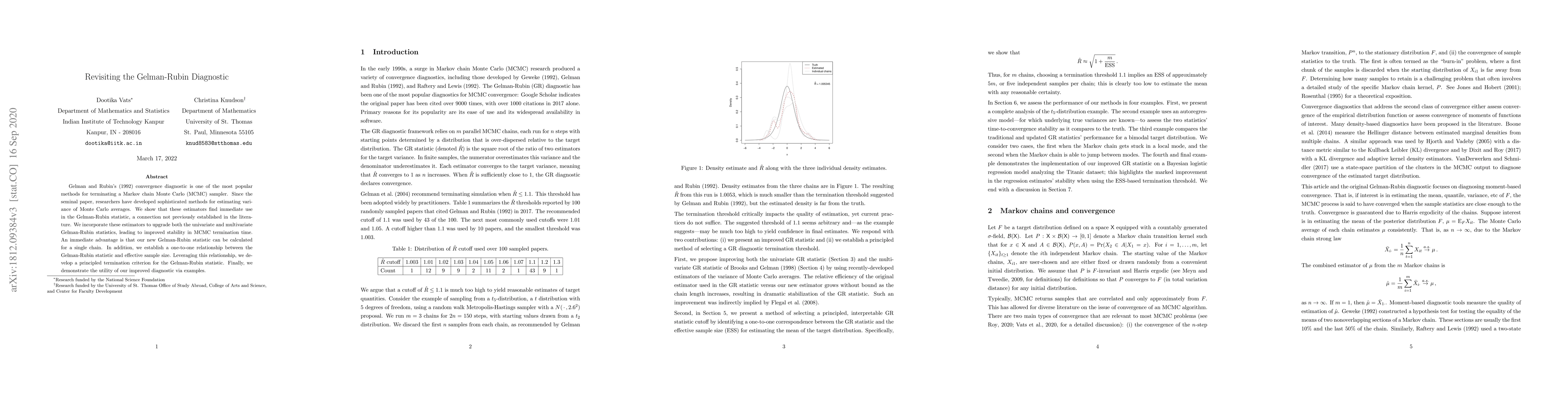 Gelman and Rubin's (1992) convergence diagnostic is one of the most popular methods for terminating a Markov chain Monte Carlo (MCMC) sampler. Since the seminal paper, researchers have developed sophisticated methods for estimating variance of Monte Carlo averages. We show that these estimators find immediate use in the Gelman-Rubin statistic, a connection not previously established in the literature. We incorporate these estimators to upgrade both the univariate and multivariate Gelman-Rubin statistics, leading to improved stability in MCMC termination time. An immediate advantage is that our new Gelman-Rubin statistic can be calculated for a single chain. In addition, we establish a one-to-one relationship between the Gelman-Rubin statistic and effective sample size. Leveraging this relationship, we develop a principled termination criterion for the Gelman-Rubin statistic. Finally, we demonstrate the utility of our improved diagnostic via examples.