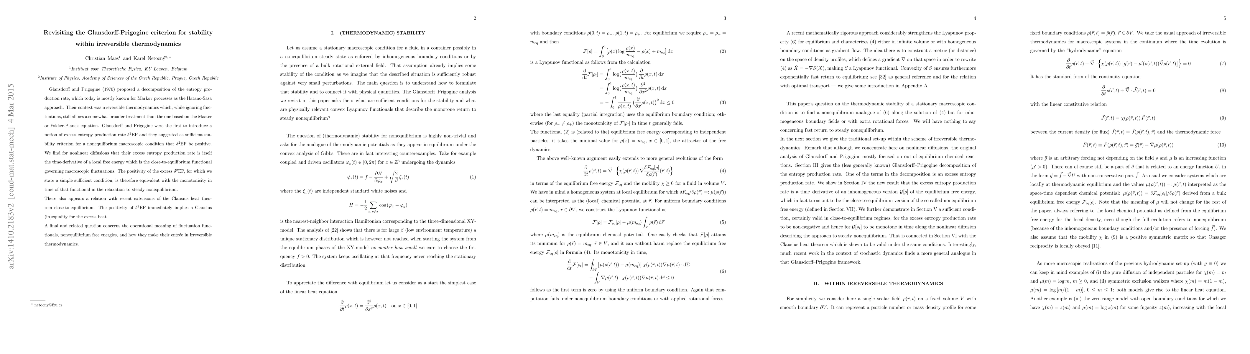 Glansdorff and Prigogine (1970) proposed a decomposition of the entropy production rate, which today is mostly known for Markov processes as the Hatano-Sasa approach. Their context was irreversible thermodynamics which, while ignoring fluctuations, still allows a somewhat broader treatment than the one based on the Master or Fokker-Planck equation. Glansdorff and Prigogine were the first to introduce a notion of excess entropy production rate $\delta^2$EP and they suggested as sufficient stability criterion for a nonequilibrium macroscopic condition that $\delta^2$EP be positive. We find for nonlinear diffusions that their excess entropy production rate is itself the time-derivative of a local free energy which is the close-to-equilibrium functional governing macroscopic fluctuations. The positivity of the excess $\delta^2$EP, for which we state a simple sufficient condition, is therefore equivalent with the monotonicity in time of that functional in the relaxation to steady nonequilibrium. There also appears a relation with recent extensions of the Clausius heat theorem close-to-equilibrium. The positivity of $\delta^2$EP immediately implies a Clausius (in)equality for the excess heat. A final and related question concerns the operational meaning of fluctuation functionals, nonequilibrium free energies, and how they make their entr\'ee in irreversible thermodynamics.