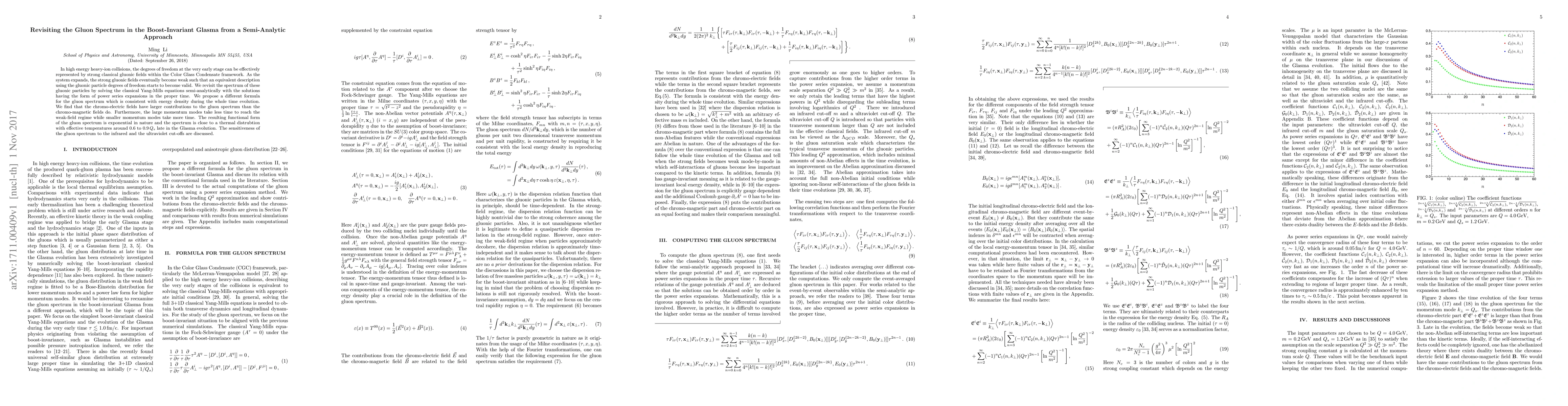 In high energy heavy-ion collisions, the degrees of freedom at the very early stage can be effectively represented by strong classical gluonic fields within the Color Glass Condensate framework. As the system expands, the strong gluonic fields eventually become weak such that an equivalent description using the gluonic particle degrees of freedom starts to become valid. We revisit the spectrum of these gluonic particles by solving the classical Yang-Mills equations semi-analytically with the solutions having the form of power series expansions in the proper time. We propose a different formula for the gluon spectrum which is consistent with energy density during the whole time evolution. We find that the chromo-electric fields have larger contributions to the gluon spectrum than the chromo-magnetic fields do. Furthermore, the large momentum modes take less time to reach the weak-field regime while smaller momentum modes take more time. The resulting functional form of the gluon spectrum is exponential in nature and the spectrum is close to a thermal distrubtion with effective temperatures around $0.6$ to $0.9\, Q_s$ late in the Glasma evolution. The sensitiveness of the gluon spectrum to the infrared and the ultraviolet cut-offs are discussed.