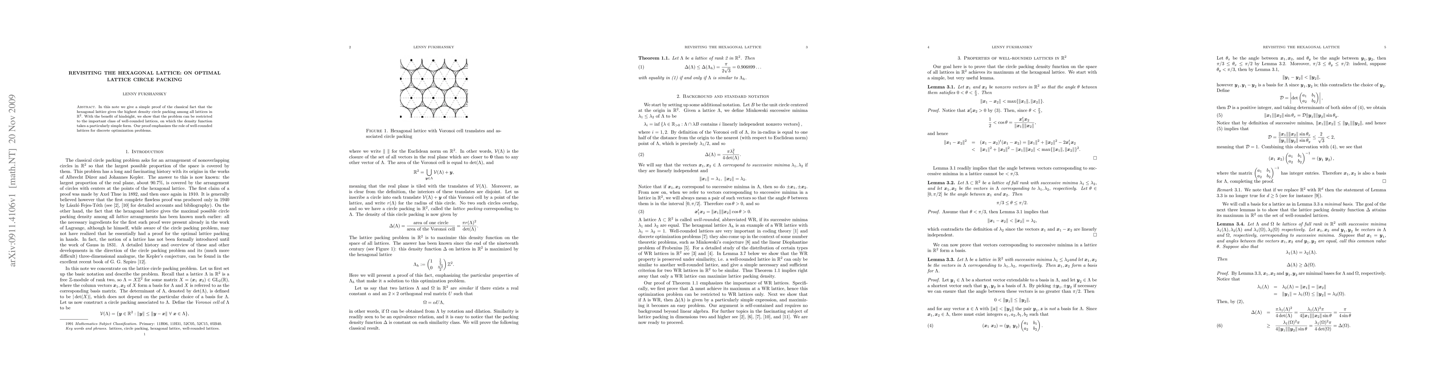 In this note we give a simple proof of the classical fact that the hexagonal lattice gives the highest density circle packing among all lattices in $R^2$. With the benefit of hindsight, we show that the problem can be restricted to the important class of well-rounded lattices, on which the density function takes a particularly simple form. Our proof emphasizes the role of well-rounded lattices for discrete optimization problems.