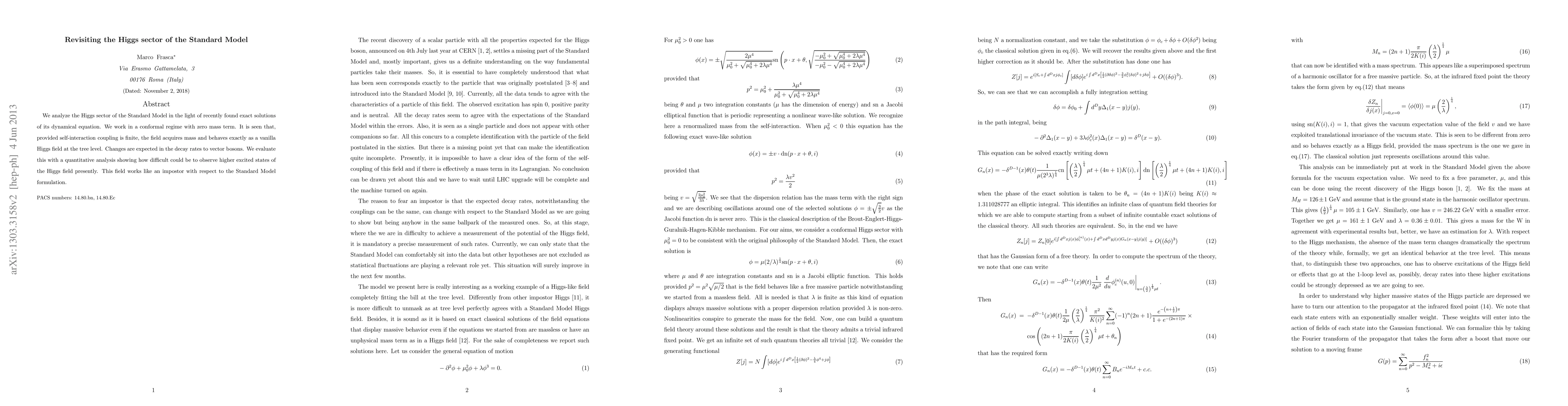 This paper revisits the Higgs sector of the Standard Model using new exact solutions, revealing that the field behaves like a vanilla Higgs at tree level despite a conformal regime with zero mass term, though it may exhibit altered decay rates to vector bosons, making higher excited states hard to observe.