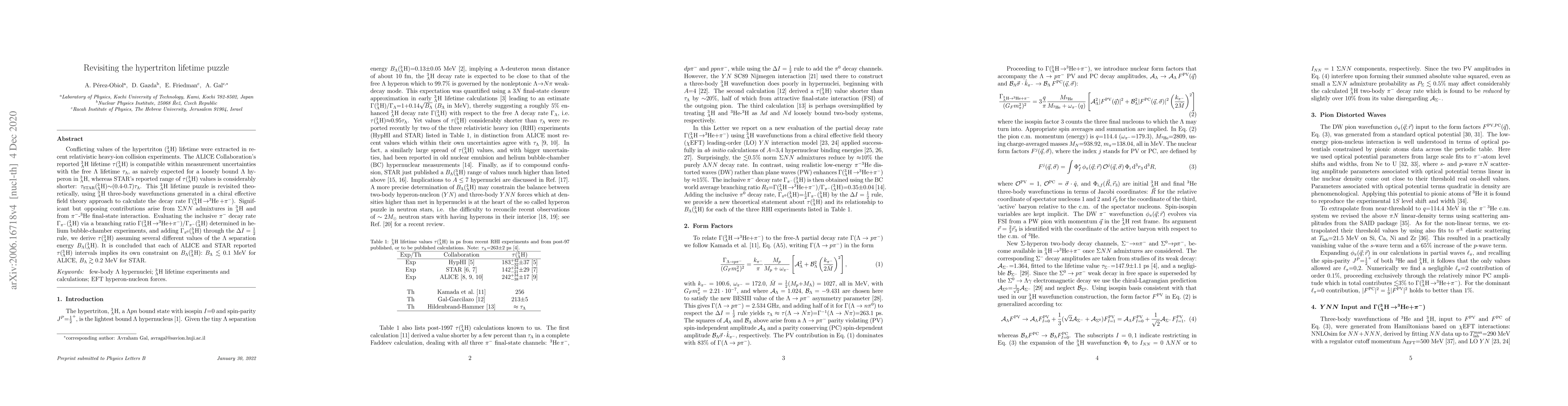 Conflicting values of the hypertriton ($_{\Lambda}^{3}$H) lifetime were extracted in recent relativistic heavy-ion collision experiments. The ALICE Collaboration's reported $_{\Lambda}^{3}$H lifetime $\tau(_{\Lambda}^{3}$H) is compatible within measurement uncertainties with the free $\Lambda$ lifetime $\tau_{\Lambda}$, as naively expected for a loosely bound $\Lambda$ hyperon in $_{\Lambda}^{3}$H, whereas STAR's reported range of $\tau(_{\Lambda}^{3}$H) values is considerably shorter: $\tau_{\rm STAR}(_{\Lambda}^{3}$H)$\sim$(0.4-0.7)$\tau_{\Lambda}$. This $_{\Lambda}^{3}$H lifetime puzzle is revisited theoretically using $_{\Lambda}^{3}$H three-body wavefunctions generated in a chiral effective field theory approach to calculate the decay rate $\Gamma(_{\Lambda}^{3}$H$\,\to ^3$He$\,+\pi^-$). Significant but opposing contributions arise from $\Sigma NN$ admixtures in $_{\Lambda}^{3}$H and from $\pi^-$-$^3$He final-state interaction. Evaluating the inclusive $\pi^-$ decay rate $\Gamma_{\pi^-}(_{\Lambda}^{3}$H) via a branching ratio $\Gamma(_{\Lambda}^{3}$H$\,\to ^{3}$He+$\pi^-)/\Gamma_{\pi^-}(_{\Lambda}^{3}$H) determined in helium bubble-chamber experiments, and adding $\Gamma_{\pi^0}(_{\Lambda}^{3}$H) through the $\Delta I=\frac{1}{2}$ rule, we derive $\tau(_{\Lambda}^{3}$H) assuming several different values of the $\Lambda$ separation energy $B_{\Lambda}(_{\Lambda}^{3}$H). It is concluded that each of ALICE and STAR reported $\tau(_{\Lambda}^{3}$H) intervals implies its own constraint on $B_{\Lambda}(_{\Lambda}^{3}$H): $B_{\Lambda}\lesssim 0.1$ MeV for ALICE, $B_{\Lambda}\gtrsim 0.2$ MeV for STAR.
