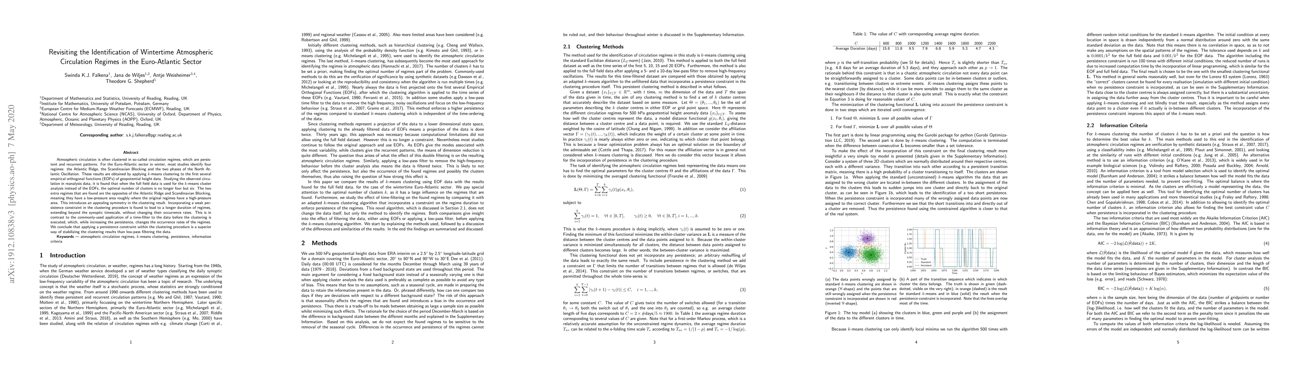 This paper identifies six atmospheric circulation regimes in the Euro-Atlantic sector during winter using k-means clustering on full field geopotential height data, revealing a symmetrical pair of low-pressure regimes opposite to the traditional four high-pressure regimes. Incorporating a persistence constraint in clustering extends regime durations without altering occurrence rates, outperforming traditional low-pass filtering.