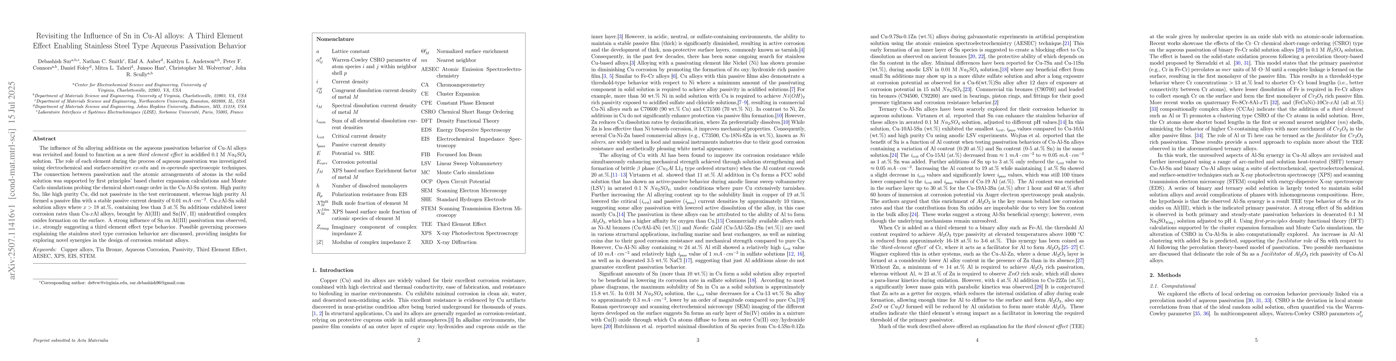 The influence of Sn alloying additions on the aqueous passivation behavior of Cu-Al alloys was revisited and found to function as a new third element effect in acidified 0.1 M Na2SO4 solution. The role of each element during the process of aqueous passivation was investigated using electrochemical and surface-sensitive ex-situ and in-operando spectroscopic techniques. The connection between passivation and the atomic arrangements of atoms in the solid solution was supported by first principles based cluster expansion calculations and Monte Carlo simulations probing the chemical short-range order in the Cu-Al-Sn system. High purity Sn, like high purity Cu, did not passivate in the test environment, whereas high purity Al formed a passive film with a stable passive current density of 0.01 mA/cm^2. Cu-xAl-Sn solid solution alloys where x greater than 18 at.%, containing less than 3 at.% Sn additions exhibited lower corrosion rates than Cu-xAl alloys, brought by Al(III) and Sn(IV, II) unidentified complex oxides formation on the surface. A strong influence of Sn on Al(III) passivation was observed, i.e., strongly suggesting a third element effect type behavior. Possible governing processes explaining the stainless steel type corrosion behavior are discussed, providing insights for exploring novel synergies in the design of corrosion resistant alloys.