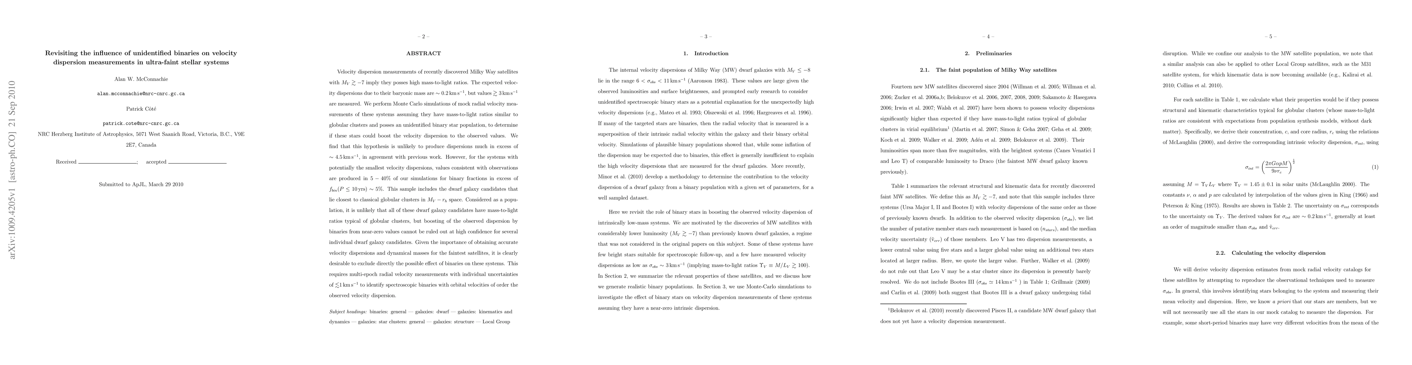Velocity dispersion measurements of recently discovered Milky Way satellites with $M_V\gtrsim-7$ imply they posses high mass-to-light ratios. The expected velocity dispersions due to their baryonic mass are $\sim0.2$\,km\,s$^{-1}$, but values $\gtrsim3$\,km\,s$^{-1}$ are measured. We perform Monte Carlo simulations of mock radial velocity measurements of these systems assuming they have mass-to-light ratios similar to globular clusters and posses an unidentified binary star population, to determine if these stars could boost the velocity dispersion to the observed values. We find that this hypothesis is unlikely to produce dispersions much in excess of $\sim 4.5$\,km\,s$^{-1}$, in agreement with previous work. However, for the systems with potentially the smallest velocity dispersions, values consistent with observations are produced in 5-40% of our simulations for binary fractions in excess of $f_{bin}(P\le10$\,yrs$)\sim5%$. This sample includes the dwarf galaxy candidates that lie closest to classical globular clusters in $M_V-r_h$ space. Considered as a population, it is unlikely that all of these dwarf galaxy candidates have mass-to-light ratios typical of globular clusters, but boosting of the observed dispersion by binaries from near-zero values cannot be ruled out at high confidence for several individual dwarf galaxy candidates. Given the importance of obtaining accurate velocity dispersions and dynamical masses for the faintest satellites, it is clearly desirable to exclude directly the possible effect of binaries on these systems. This requires multi-epoch radial velocity measurements with individual uncertainties of $\lesssim$1\,km\,s$^{-1}$ to identify spectroscopic binaries with orbital velocities of order the observed velocity dispersion.