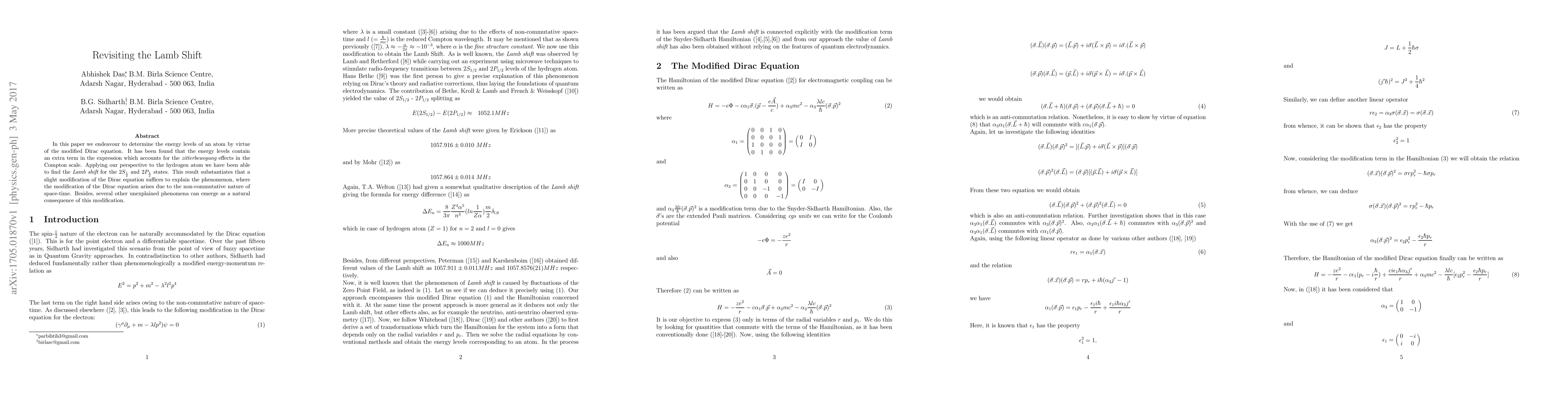 This paper revisits the Lamb shift by employing a modified Dirac equation to determine atomic energy levels, revealing an extra term accounting for zitterbewegung effects. The study finds the Lamb shift for hydrogen's $2S_{\frac{1}{2}}$ and $2P_{\frac{1}{2}}$ states, demonstrating that a slight Dirac equation modification, driven by non-commutative space-time, can explain this phenomenon.