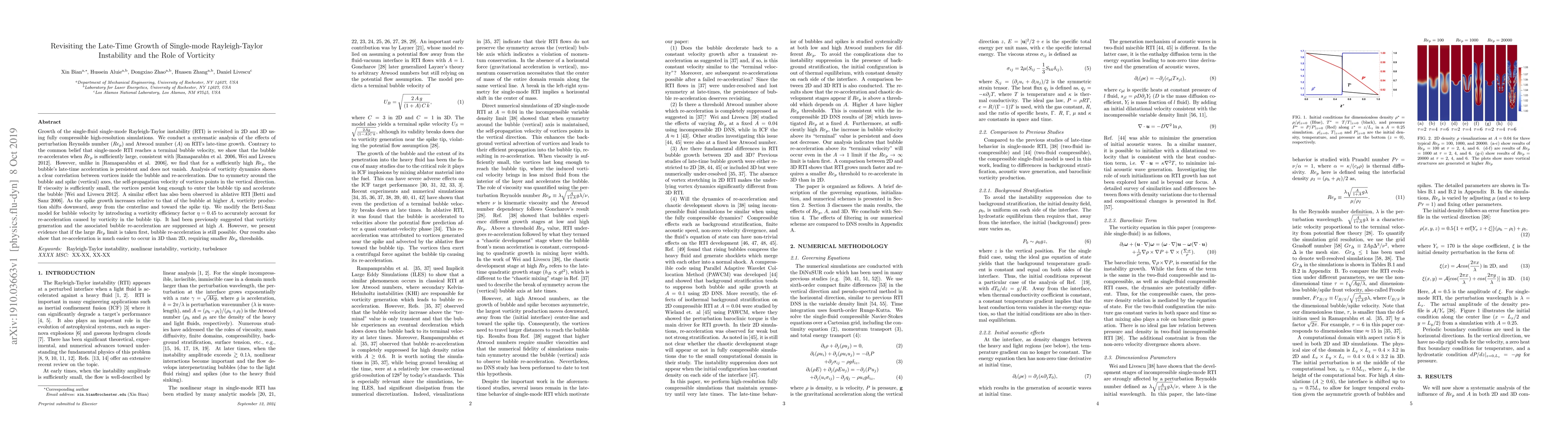 Growth of the single-fluid single-mode Rayleigh-Taylor instability (RTI) is revisited in 2D and 3D using fully compressible high-resolution simulations. We conduct a systematic analysis of the effects of perturbation Reynolds number ($Re_p$) and Atwood number ($A$) on RTI's late-time growth. Contrary to the common belief that single-mode RTI reaches a terminal bubble velocity, we show that the bubble re-accelerates when $Re_p$ is sufficiently large, consistent with [Ramaparabhu et al. 2006, Wei and Livescu 2012]. However, unlike in [Ramaparabhu et al. 2006], we find that for a sufficiently high $Re_p$, the bubble's late-time acceleration is persistent and does not vanish. Analysis of vorticity dynamics shows a clear correlation between vortices inside the bubble and re-acceleration. Due to symmetry around the bubble and spike (vertical) axes, the self-propagation velocity of vortices points in the vertical direction. If viscosity is sufficiently small, the vortices persist long enough to enter the bubble tip and accelerate the bubble [Wei and Livescu 2012]. A similar effect has also been observed in ablative RTI [Betti and Sanz 2006]. As the spike growth increases relative to that of the bubble at higher $A$, vorticity production shifts downward, away from the centerline and toward the spike tip. We modify the Betti-Sanz model for bubble velocity by introducing a vorticity efficiency factor $\eta=0.45$ to accurately account for re-acceleration caused by vorticity in the bubble tip. It had been previously suggested that vorticity generation and the associated bubble re-acceleration are suppressed at high $A$. However, we present evidence that if the large $Re_p$ limit is taken first, bubble re-acceleration is still possible. Our results also show that re-acceleration is much easier to occur in 3D than 2D, requiring smaller $Re_p$ thresholds.