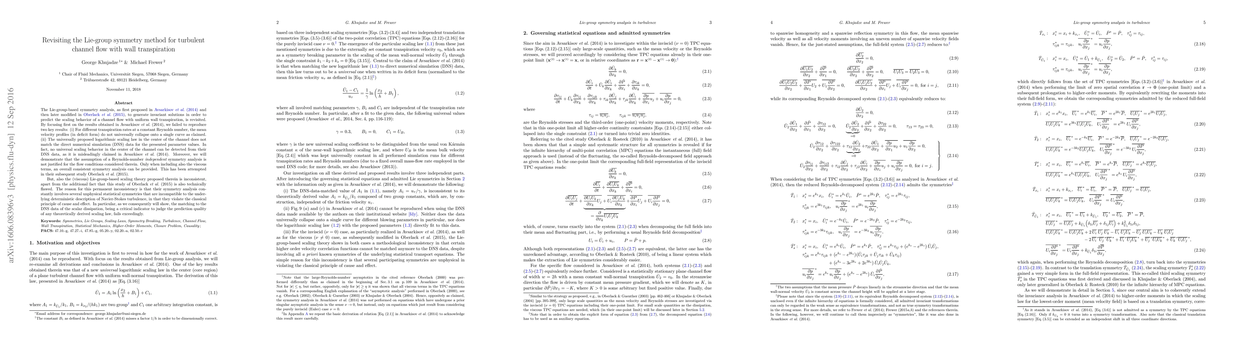 The Lie-group-based symmetry analysis, as first proposed in Avsarkisov et al. (2014) and then later modified in Oberlack et al. (2015), to generate invariant solutions in order to predict the scaling behavior of a channel flow with uniform wall transpiration, is revisited. By focusing first on the results obtained in Avsarkisov et al. (2014), we failed to reproduce two key results: (i) For different transpiration rates at a constant Reynolds number, the mean velocity profiles (in deficit form) do not universally collapse onto a single curve as claimed. (ii) The universally proposed logarithmic scaling law in the center of the channel does not match the direct numerical simulation (DNS) data for the presented parameter values. In fact, no universal scaling behavior in the center of the channel can be detected from their DNS data, as it is misleadingly claimed in Avsarkisov et al. (2014). Moreover, we will demonstrate that the assumption of a Reynolds-number independent symmetry analysis is not justified for the flow conditions considered therein. Only when including also the viscous terms, an overall consistent symmetry analysis can be provided. This has been attempted in their subsequent study Oberlack et al. (2015). But, also the (viscous) Lie-group-based scaling theory proposed therein is inconsistent, apart from the additional fact that this study of Oberlack et al. (2015) is also technically flawed. The reason for this permanent inconsistency is that their symmetry analysis constantly involves several unphysical statistical symmetries that are incompatible to the underlying deterministic description of Navier-Stokes turbulence.