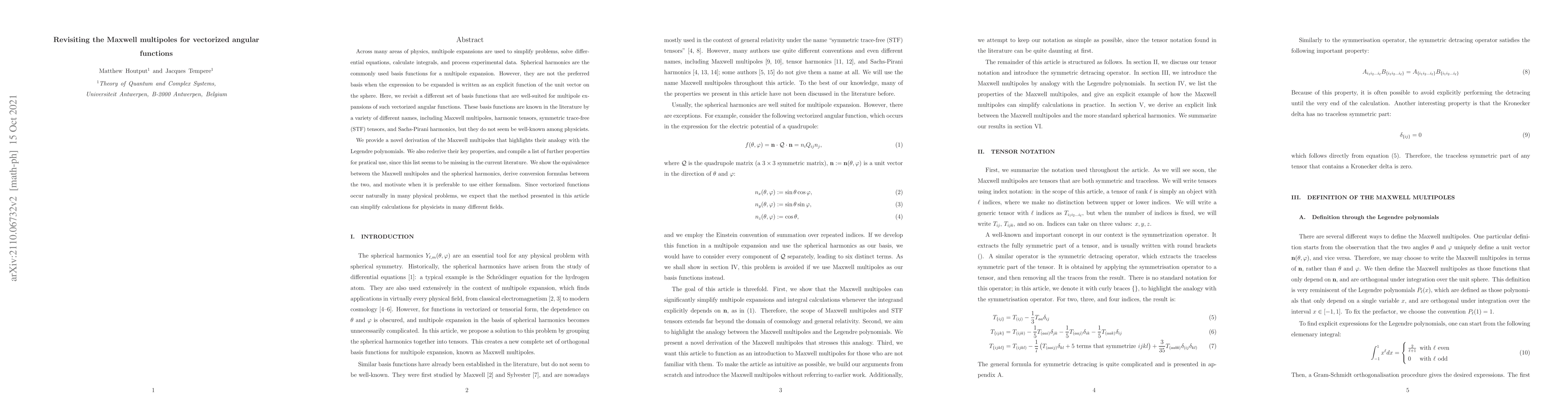 This paper revisits Maxwell multipoles, a set of basis functions for multipole expansions of vectorized angular functions, providing a novel derivation and highlighting their analogy with Legendre polynomials. It also derives conversion formulas between Maxwell multipoles and spherical harmonics, aiming to simplify calculations for physicists dealing with vectorized angular functions.