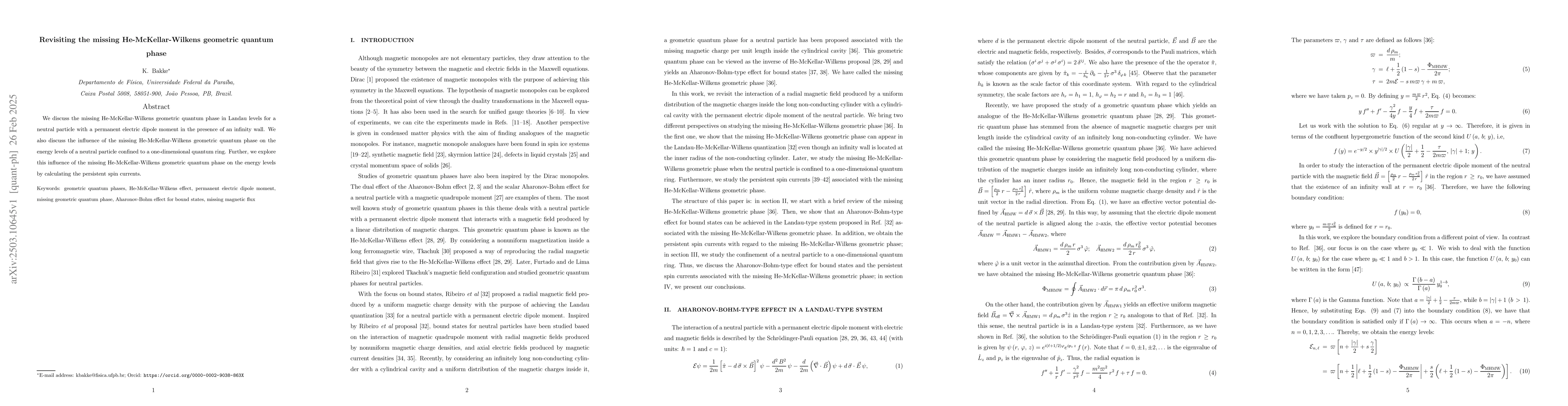 The paper presents a detailed analysis of how the missing He-McKellar-Wilkens geometric phase affects energy levels and persistent spin currents in a system of a neutral particle with a permanent electric dipole moment interacting with an inhomogeneous magnetic field.