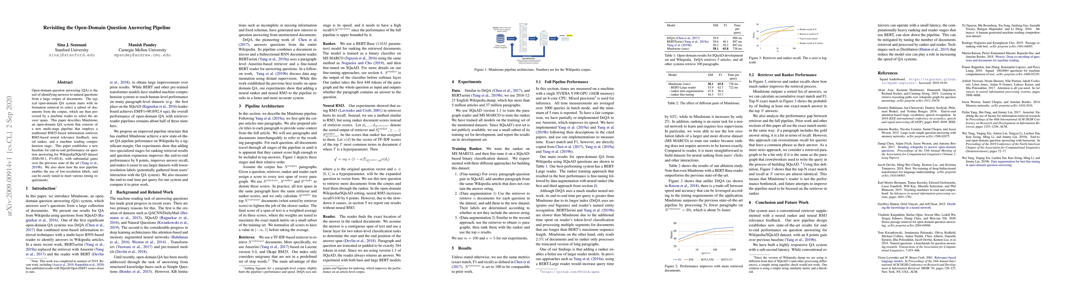 Open-domain question answering (QA) is the tasl of identifying answers to natural questions from a large corpus of documents. The typical open-domain QA system starts with information retrieval to select a subset of documents from the corpus, which are then processed by a machine reader to select the answer spans. This paper describes Mindstone, an open-domain QA system that consists of a new multi-stage pipeline that employs a traditional BM25-based information retriever, RM3-based neural relevance feedback, neural ranker, and a machine reading comprehension stage. This paper establishes a new baseline for end-to-end performance on question answering for Wikipedia/SQuAD dataset (EM=58.1, F1=65.8), with substantial gains over the previous state of the art (Yang et al., 2019b). We also show how the new pipeline enables the use of low-resolution labels, and can be easily tuned to meet various timing requirements.