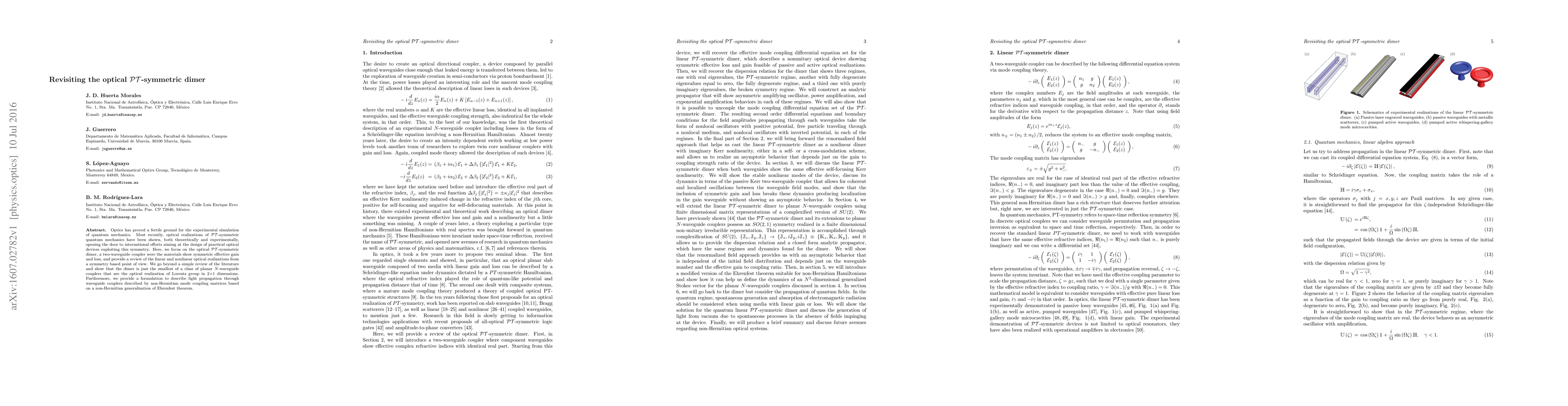 Optics has proved a fertile ground for the experimental simulation of quantum mechanics. Most recently, optical realizations of $\mathcal{PT}$-symmetric quantum mechanics have been shown, both theoretically and experimentally, opening the door to international efforts aiming at the design of practical optical devices exploiting this symmetry. Here, we focus on the optical $\mathcal{PT}$-symmetric dimer, a two-waveguide coupler were the materials show symmetric effective gain and loss, and provide a review of the linear and nonlinear optical realizations from a symmetry based point of view. We go beyond a simple review of the literature and show that the dimer is just the smallest of a class of planar $N$-waveguide couplers that are the optical realization of Lorentz group in 2+1 dimensions. Furthermore, we provide a formulation to describe light propagation through waveguide couplers described by non-Hermitian mode coupling matrices based on a non-Hermitian generalization of Ehrenfest theorem.