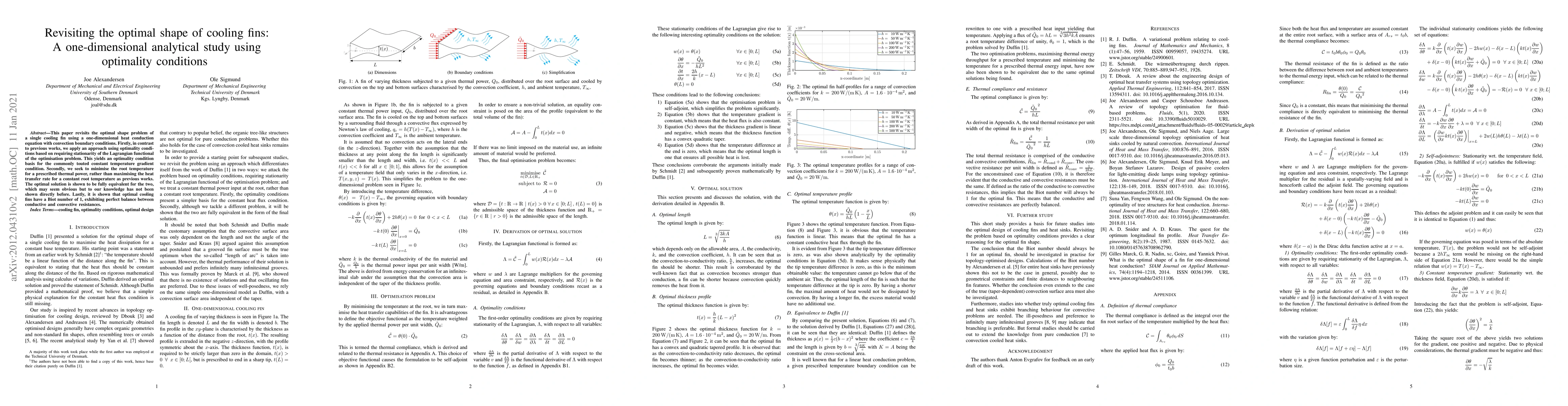 This paper revisits the optimal shape problem of a single cooling fin using a one-dimensional heat conduction equation with convection boundary conditions. Firstly, in contrast to previous works, we apply an approach using optimality conditions based on requiring stationarity of the Lagrangian functional of the optimisation problem. This yields an optimality condition basis for the commonly touted constant temperature gradient condition. Secondly, we seek to minimise the root temperature for a prescribed thermal power, rather than maximising the heat transfer rate for a constant root temperature as previous works. The optimal solution is shown to be fully equivalent for the two, which may seem obvious but to our knowledge has not been shown directly before. Lastly, it is shown that optimal cooling fins have a Biot number of 1, exhibiting perfect balance between conductive and convective resistances.