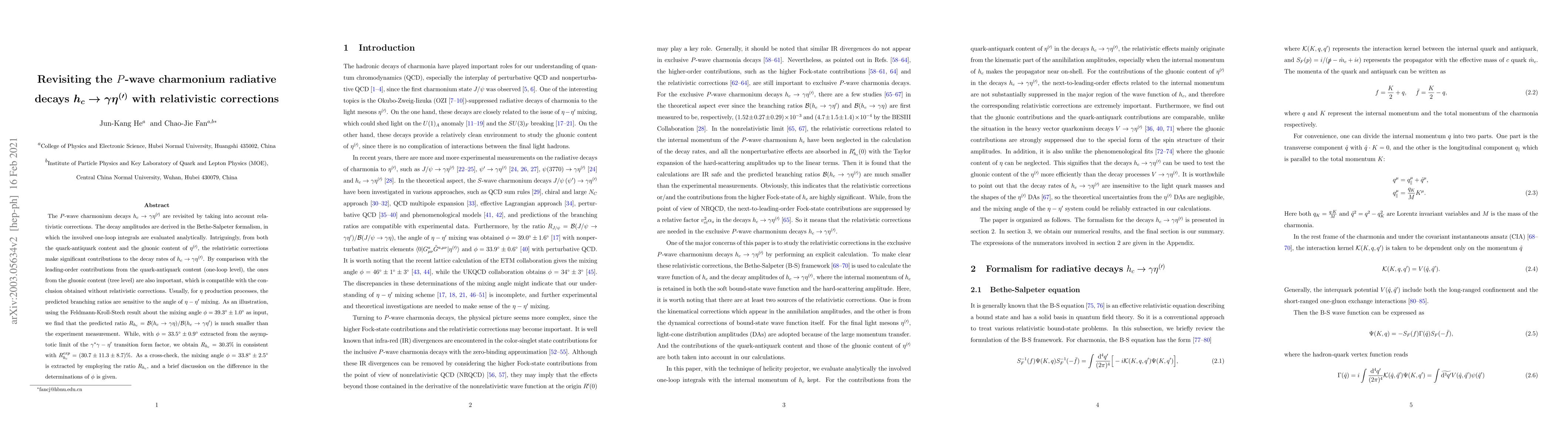 The $P$-wave charmonium decays $h_{c}\rightarrow\gamma\eta^{(\prime)}$ are revisited by taking into account relativistic corrections. The decay amplitudes are derived in the Bethe-Salpeter formalism, in which the involved one-loop integrals are evaluated analytically. Intriguingly, from both the quark-antiquark content and the gluonic content of $\eta^{(\prime)}$, the relativistic corrections make significant contributions to the decay rates of $h_{c}\rightarrow\gamma\eta^{(\prime)}$. By comparison with the leading-order contributions from the quark-antiquark content (one-loop level), the ones from the gluonic content (tree level) are also important, which is compatible with the conclusion obtained without relativistic corrections. Usually, for $\eta$ production processes, the predicted branching ratios are sensitive to the angle of $\eta-\eta^{\prime}$ mixing. As an illustration, using the Feldmann-Kroll-Stech result about the mixing angle $\phi=39.3^{\circ}\pm1.0^{\circ}$ as input, we find that the predicted ratio $R_{h_{c}}=\mathcal{B}(h_{c}\rightarrow\gamma\eta)/\mathcal{B}(h_{c}\rightarrow\gamma\eta^{\prime})$ is much smaller than the experiment measurement. While, with $\phi=33.5^{\circ}\pm0.9^{\circ}$ extracted from the asymptotic limit of the $\gamma^{\ast}\gamma-\eta^{\prime}$ transition form factor, we obtain $R_{h_{c}}=30.3\%$ in consistent with $R_{h_{c}}^{exp}=(30.7\pm11.3\pm8.7)\%$. As a cross-check, the mixing angle $\phi=33.8^{\circ}\pm2.5^{\circ}$ is extracted by employing the ratio $R_{h_{c}}$, and a brief discussion on the difference in the determinations of $\phi$ is given.