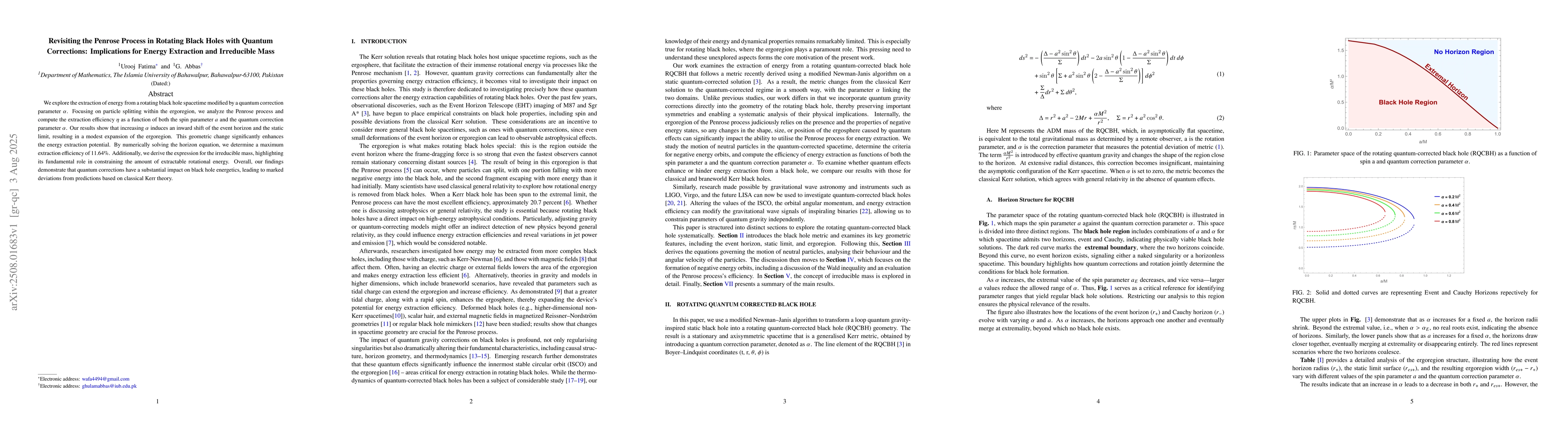 We explore the extraction of energy from a rotating black hole spacetime modified by a quantum correction parameter \( \alpha \). Focusing on particle splitting within the ergoregion, we analyze the Penrose process and compute the extraction efficiency \( \eta \) as a function of both the spin parameter \( a \) and the quantum correction parameter \( \alpha \). Our results show that increasing \( \alpha \) induces an inward shift of the event horizon and the static limit, resulting in a modest expansion of the ergoregion. This geometric change significantly enhances the energy extraction potential. By numerically solving the horizon equation, we determine a maximum extraction efficiency of 11.64\%. Additionally, we derive the expression for the irreducible mass, highlighting its fundamental role in constraining the amount of extractable rotational energy. Overall, our findings demonstrate that quantum corrections have a substantial impact on black hole energetics, leading to marked deviations from predictions based on classical Kerr theory.
