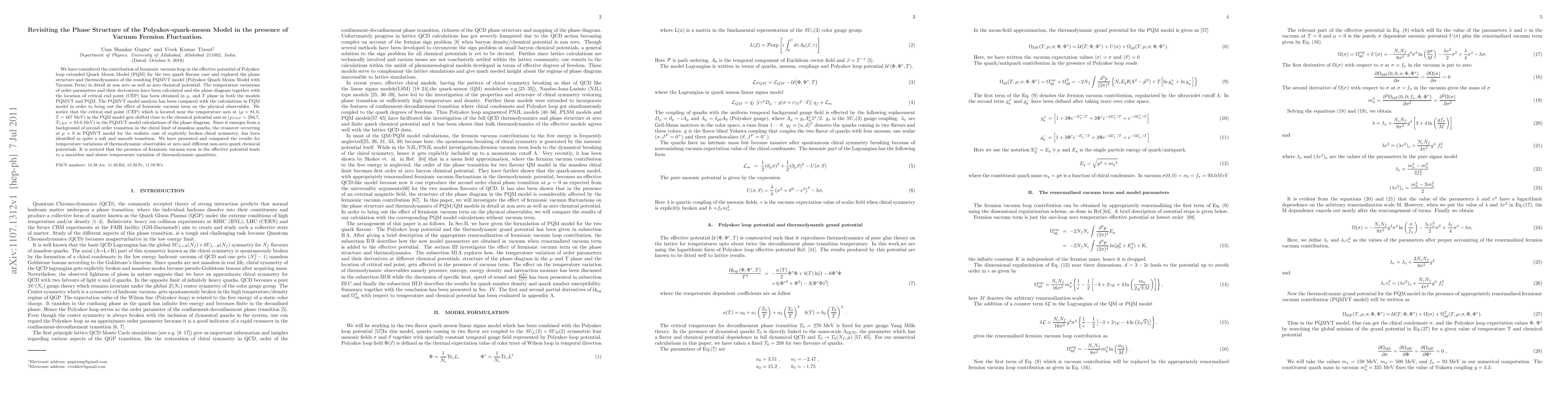 We have considered the contribution of fermionic vacuum loop in the effective potential of Polyakov loop extended Quark Meson Model (PQM) for the two quark flavour case and explored the phase structure and thermodynamics of the resulting PQMVT model (Polyakov Quark Meson Model with Vacuum Term) in detail at non zero as well as zero chemical potential. The temperature variations of order parameters and their derivatives have been calculated and the phase diagram together with the location of critical end point (CEP) has been obtained in $\mu$, and $T$ plane in both the models PQMVT and PQM. The PQMVT model analysis has been compared with the calculations in PQM model in order to bring out the effect of fermionic vacuum term on the physical observables. We notice that the critical end point (CEP) which is located near the temperature axis at ($\mu=81.0$, $T = 167$ MeV) in the PQM model gets shifted close to the chemical potential axis at ($\mu_{CEP}=294.7$, $T_{CEP}=84.0$ MeV) in the PQMVT model calculations of the phase diagram. Since it emerges from a background of second order transition in the chiral limit of massless quarks, the crossover occurring at $\mu$ = 0 in PQMVT model for the realistic case of explicitly broken chiral symmetry, has been identified as quite a soft and smooth transition. We have presented and compared the results for temperature variations of thermodynamic observables at zero and different non-zero quark chemical potentials. It is noticed that the presence of fermionic vacuum term in the effective potential leads to a smoother and slower temperature variation of thermodynamic quantities.