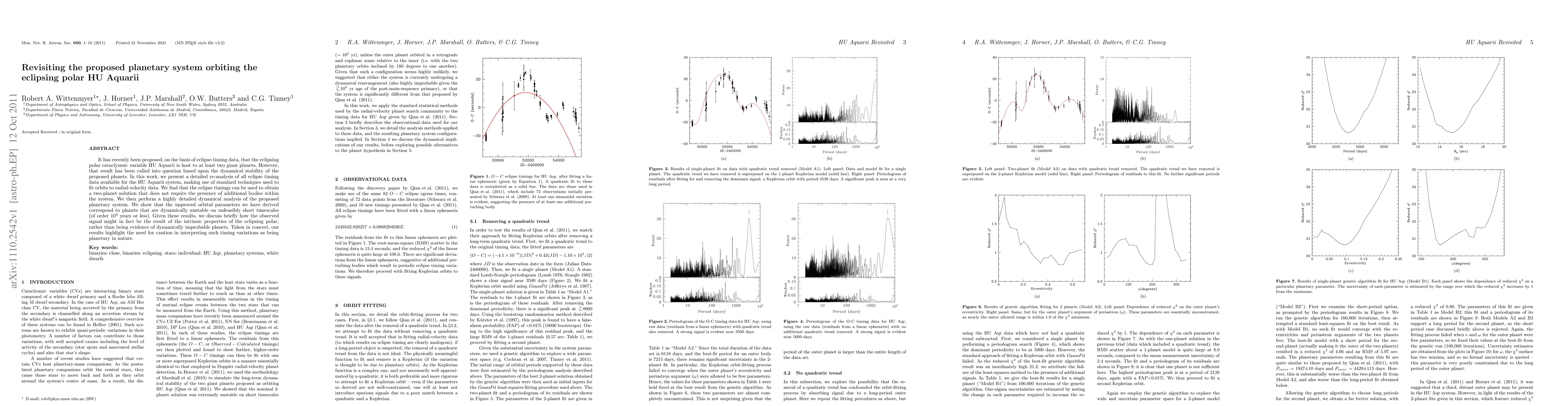 This paper re-analyzes eclipse timing data for the eclipsing polar HU Aquarii, finding a two-planet solution that does not require additional bodies. However, detailed dynamical analysis reveals the proposed planets are dynamically unstable, suggesting the observed signal may stem from the polar's intrinsic properties rather than planets.