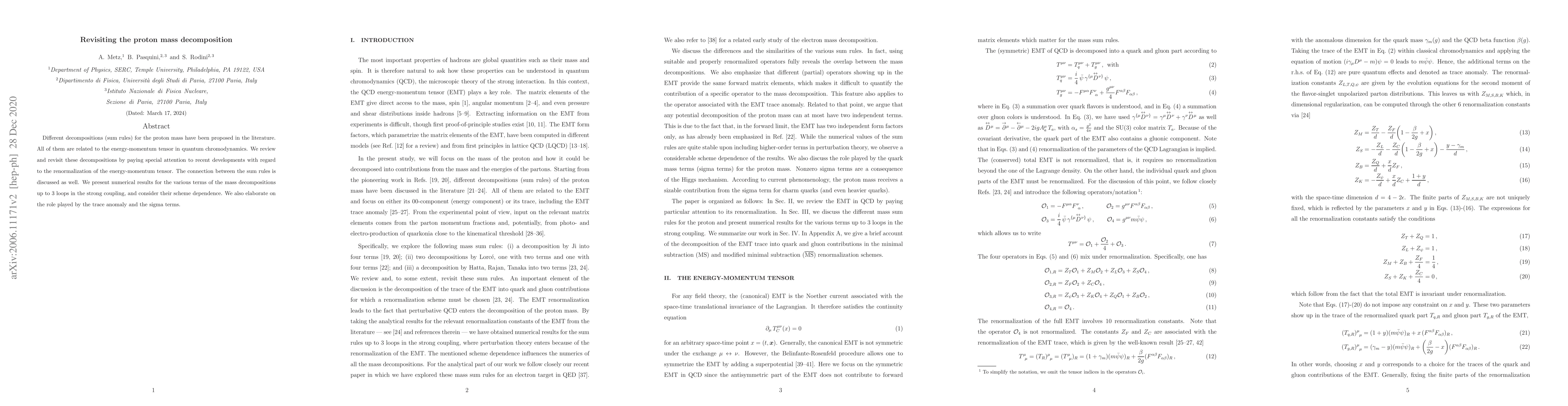 This paper revisits proton mass decompositions in quantum chromodynamics, exploring recent developments in renormalization and their implications for understanding the proton's mass structure.