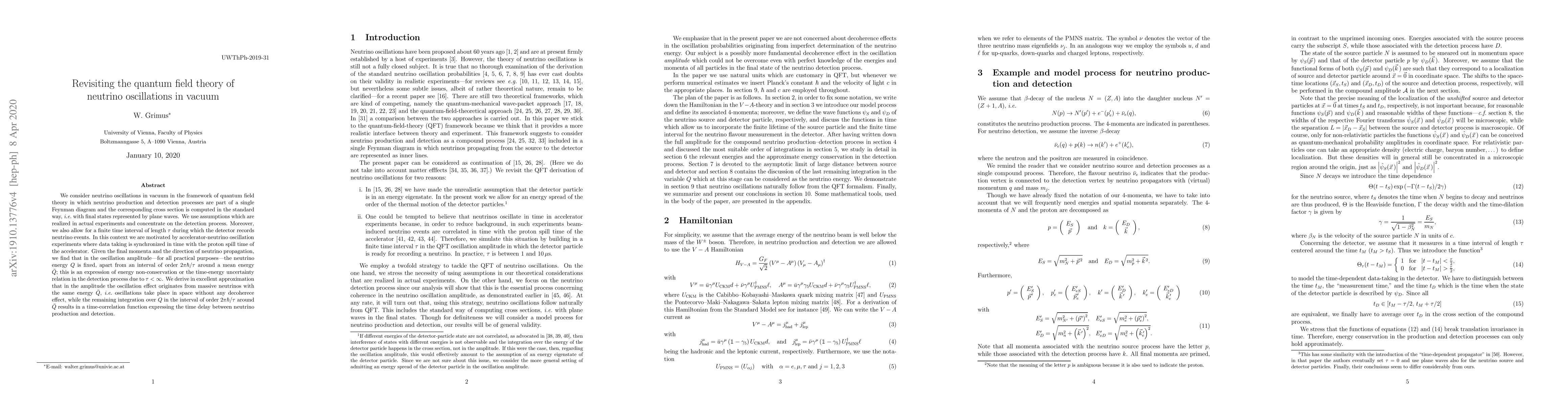 This paper revisits the quantum field theory of neutrino oscillations in vacuum, focusing on the detection process within a finite time interval. It finds that oscillations are effectively tied to a mean energy $\bar Q$, with the remaining energy interval reflecting time-energy uncertainty, leading to a time-correlation function for the production-detection delay.