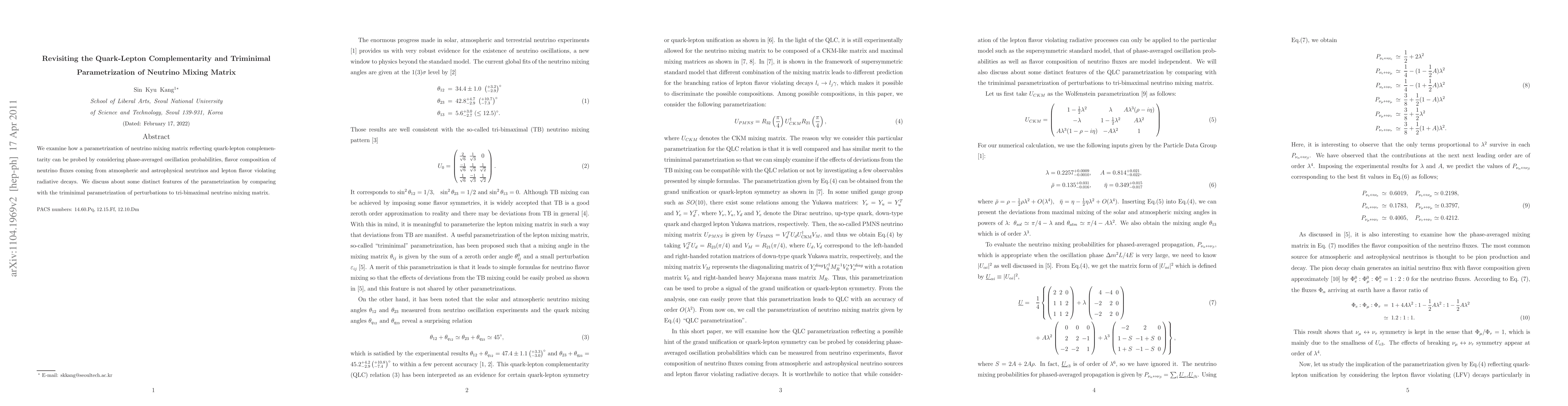 This paper explores a parametrization of the neutrino mixing matrix that embodies quark-lepton complementarity, examining its implications through phase-averaged oscillation probabilities and lepton flavor violating decays. It contrasts this with the triminimal parametrization, highlighting distinct features.