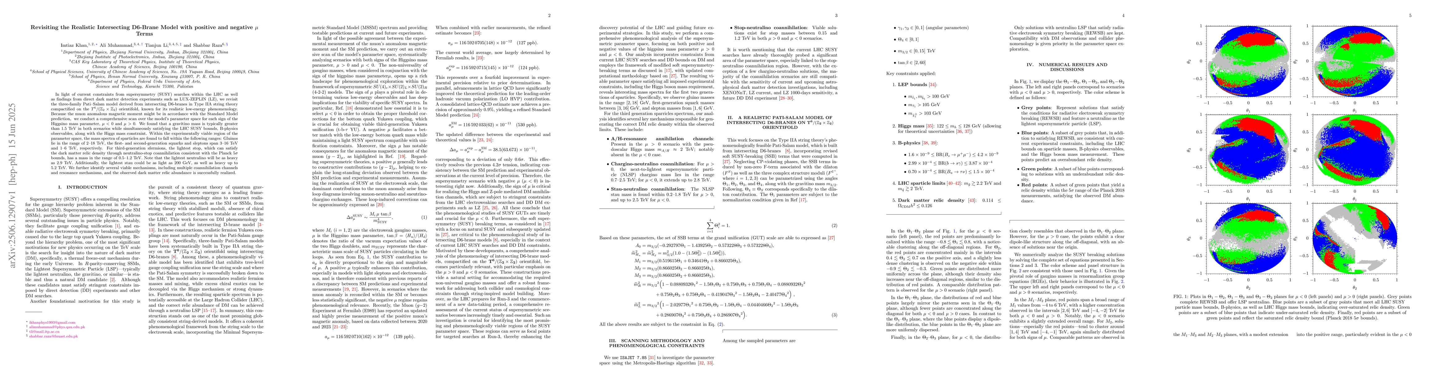 Revisiting the intersecting D6-brane model with positive and negative μ terms under LHC and dark matter constraints, the study finds typical gravitino masses >1.5 TeV, gluinos between 2-18 TeV, squarks/sleptons in 3-16 TeV and 1-6 TeV ranges, respectively. The lightest stop mass for dark matter via coannihilation is 0.5-1.2 TeV, neutralinos up to 2.9 TeV, and stau from 200 GeV to 5.2 TeV, with various mechanisms identified for reconciling observed dark matter relic abundance.