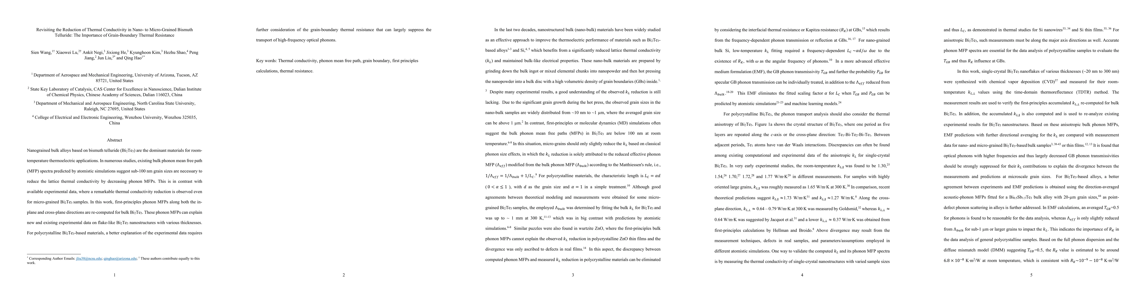 This paper revisits the thermal conductivity reduction in bismuth telluride (Bi2Te3) materials with nano- to micro-grained structures, emphasizing the role of grain-boundary thermal resistance. The study re-computes phonon mean free paths and finds that grain boundaries significantly suppress high-frequency phonon transport, explaining discrepancies between predicted and observed thermal conductivity reductions.