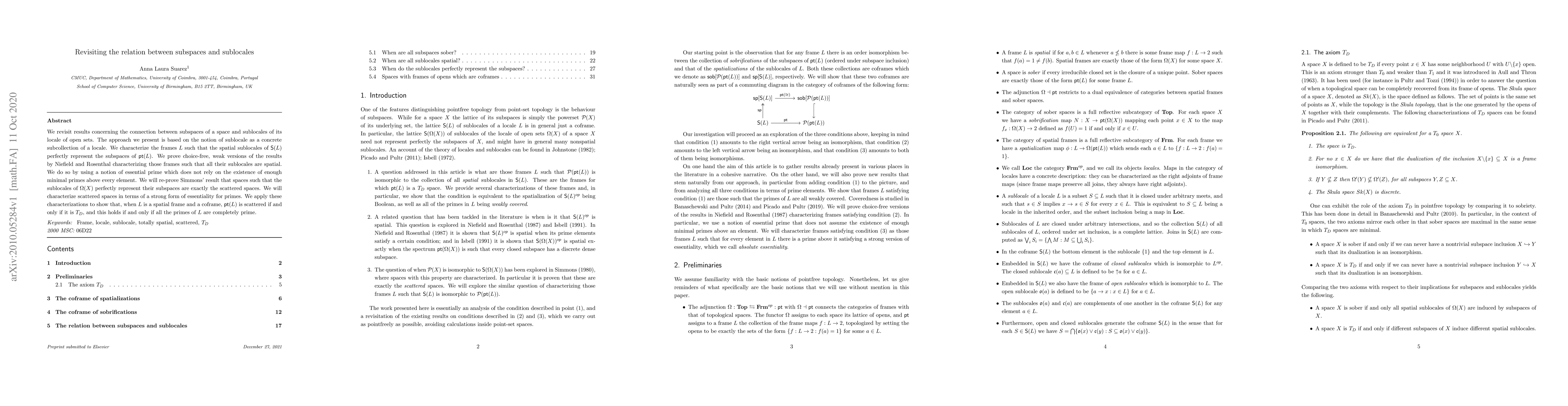 We revisit results concerning the connection between subspaces of a space and sublocales of its locale of open sets. The approach we present is based on the observation that for every locale $L$ its spatial sublocales $\mathsf{sp}[\mathsf{S}(L)]$ form a coframe which is isomorphic to the coframe $\mathsf{sob}[\mathcal{P}(\mathsf{pt}(L))]$ of sober subspaces of $\mathsf{pt}(L)$. We characterize the frames $L$ such that the spatial sublocales of $\mathsf{S}(L)$ perfectly represent the subspaces of $\mathsf{pt}(L)$. We prove choice-free, weak versions of the results by Niefield and Rosenthal characterizing those frames such that all their sublocales are spatial (i.e., those such that the sober subspaces of $\mathsf{pt}(L)$ perfectly represent the sublocales of $L$). We do so by using a notion of essential prime which does not rely on the existence of enough minimal primes above every element. We will re-prove Simmons' result that spaces such that the sublocales of $\Omega (X)$ perfectly represent their subspaces are exactly the scattered spaces. We will characterize scattered spaces in terms of a strong form of essentiality for primes. We apply these characterizations to show that, when $L$ is a spatial frame and a coframe, $\mathsf{pt}(L)$ is scattered if and only if it is $T_D$, and this holds if and only if all the primes of $L$ are completely prime.