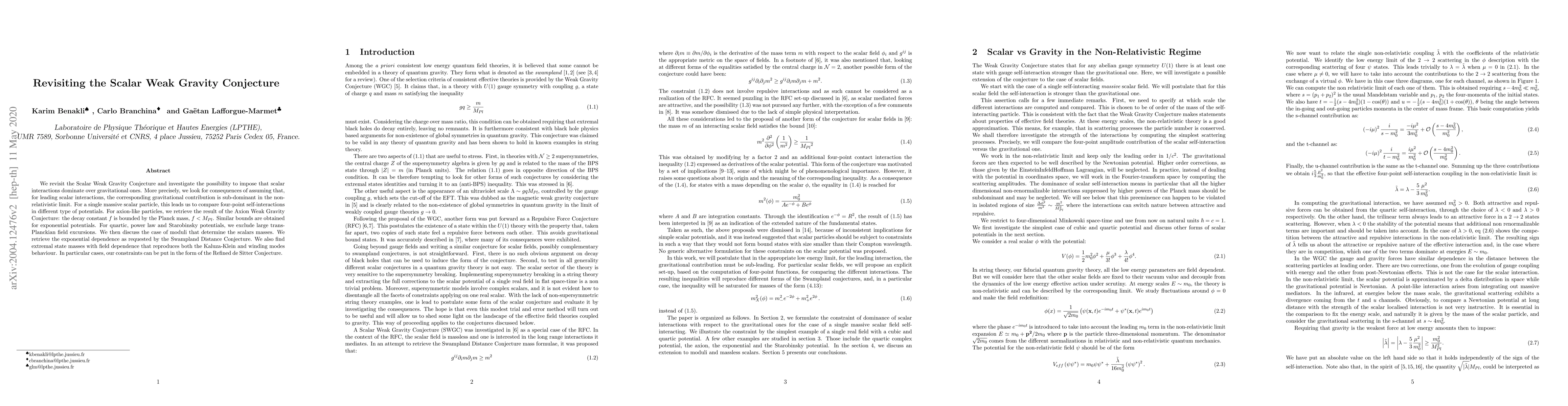 We revisit the Scalar Weak Gravity Conjecture and investigate the possibility to impose that scalar interactions dominate over gravitational ones. More precisely, we look for consequences of assuming that, for leading scalar interactions, the corresponding gravitational contribution is sub-dominant in the non-relativistic limit. For a single massive scalar particle, this leads us to compare four-point self-interactions in different type of potentials. For axion-like particles, we retrieve the result of the Axion Weak Gravity Conjecture: the decay constant $f$ is bounded by the Planck mass, $f < {M_{Pl}}$. Similar bounds are obtained for exponential potentials. For quartic, power law and Starobinsky potentials, we exclude large trans-Planckian field excursions. We then discuss the case of moduli that determine the scalars masses. We retrieve the exponential dependence as requested by the Swampland Distance Conjecture. We also find extremal state masses with field dependence that reproduces both the Kaluza-Klein and winding modes behaviour. In particular cases, our constraints can be put in the form of the Refined de Sitter Conjecture.