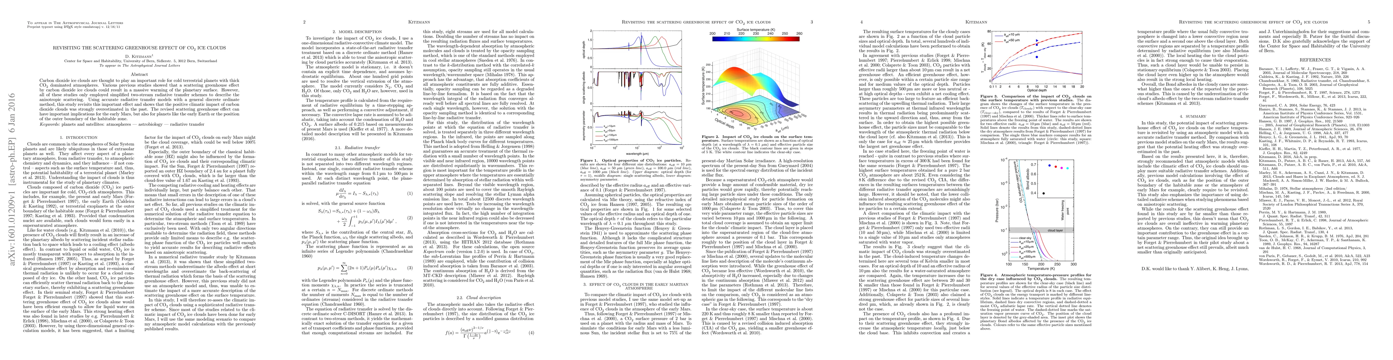 This study revisits the scattering greenhouse effect of CO2 ice clouds, finding that previous overestimations of their warming impact were due to simplified radiative transfer models. Accurate models now suggest a reduced positive climatic effect, with implications for understanding climates of early Mars, early Earth, and the habitable zone's outer boundary.