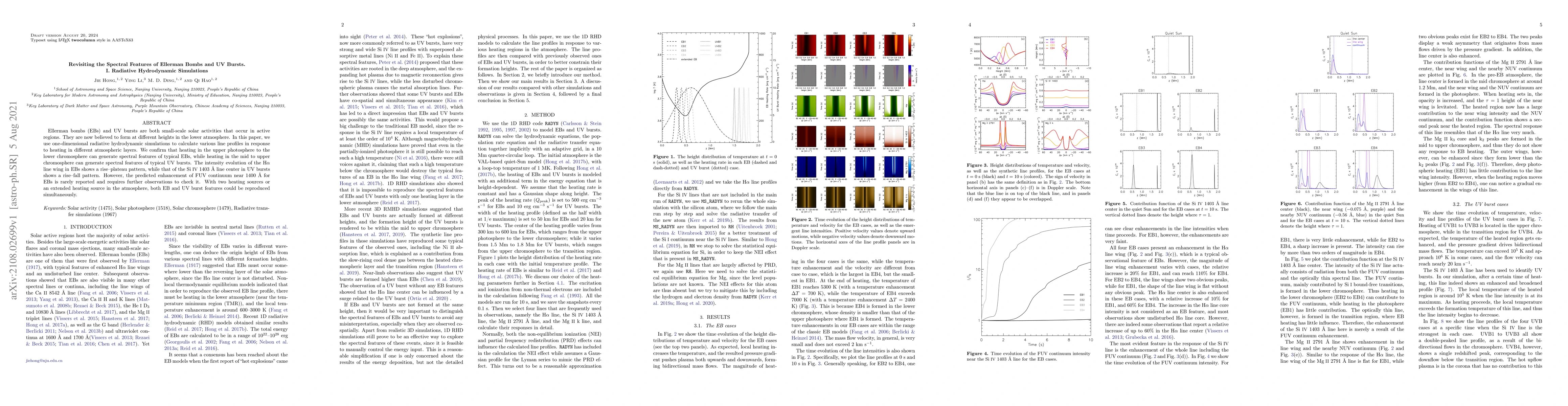 Ellerman bombs (EBs) and UV bursts are both small-scale solar activities that occur in active regions. They are now believed to form at different heights in the lower atmosphere. In this paper, we use one-dimensional radiative hydrodynamic simulations to calculate various line profiles in response to heating in different atmospheric layers. We confirm that heating in the upper photosphere to the lower chromosphere can generate spectral features of typical EBs, while heating in the mid to upper chromosphere can generate spectral features of typical UV bursts. The intensity evolution of the H$\alpha$ line wing in EBs shows a rise--plateau pattern, while that of the Si IV 1403 \r{A} line center in UV bursts shows a rise--fall pattern. However, the predicted enhancement of FUV continuum near 1400 \r{A} for EBs is rarely reported and requires further observations to check it. With two heating sources or an extended heating source in the atmosphere, both EB and UV burst features could be reproduced simultaneously.