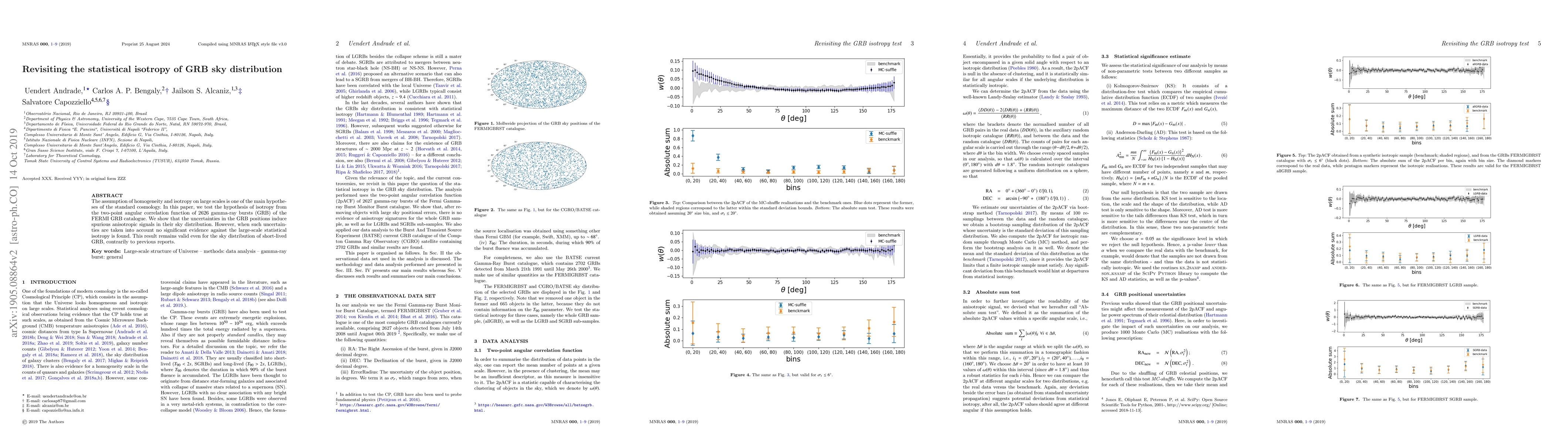 The assumption of homogeneity and isotropy on large scales is one of the main hypotheses of the standard cosmology. In this paper, we test the hypothesis of isotropy from the two-point angular correlation function of 2626 gamma-ray bursts (GRB) of the FERMI GRB catalogue. We show that the uncertainties in the GRB positions induce spurious anisotropic signals in their sky distribution. However, when such uncertainties are taken into account no significant evidence against the large-scale statistical isotropy is found. This result remains valid even for the sky distribution of short-lived GRB, contrarily to previous reports.