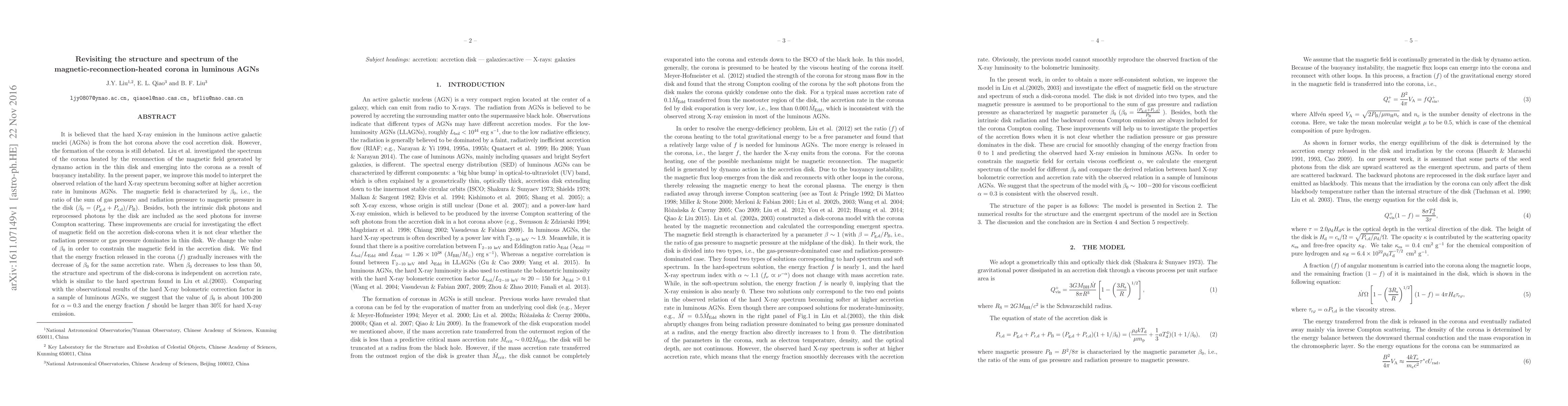 This paper revisits the structure and spectrum of the magnetic-reconnection-heated corona in luminous AGNs, improving a previous model to better interpret the observed softening of the hard X-ray spectrum at higher accretion rates. The study finds that the energy fraction released in the corona increases with decreasing $\beta_0$, suggesting a value of $\beta_0$ around 100-200 for $\alpha=0.3$ and an energy fraction $f$ larger than 30% for hard X-ray emission.