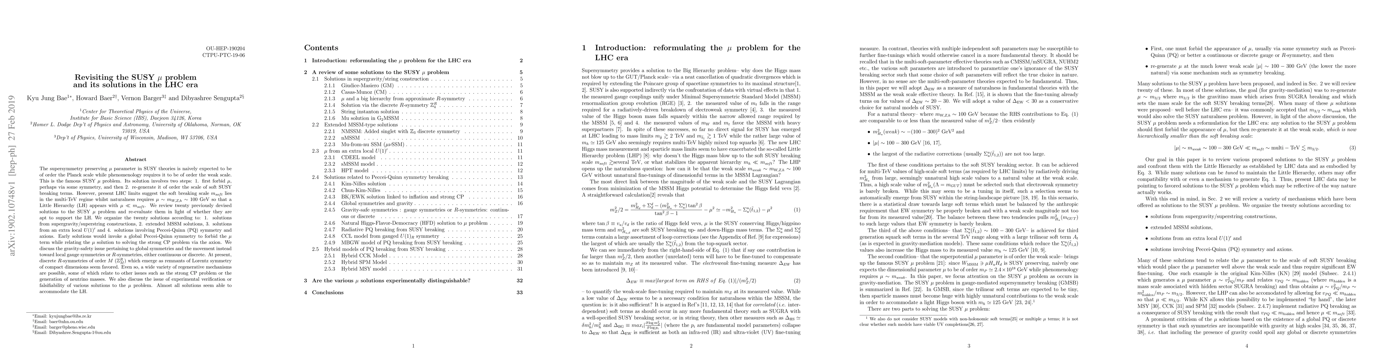 The supersymmetry preserving mu parameter in SUSY theories is naively expected to be of order the Planck scale while phenomenology requires it to be of order the weak scale. This is the famous SUSY mu problem. Its solution involves two steps: 1. first forbid mu, perhaps via some symmetry, and then 2. re-generate it of order the scale of soft SUSY breaking terms. However, present LHC limits suggest the soft breaking scale m_{soft} lies in the multi-TeV regime whilst naturalness requires mu~ m_{W,Z,h}~ 100 GeV so that a Little Hierarchy (LH) appears with mu << m_{soft}. We review twenty previously devised solutions to the SUSY mu problem and re-evaluate them in light of whether they are apt to support the LH. We organize the twenty solutions according to: 1. solutions from supergravity/superstring constructions, 2. extended MSSM solutions, 3. solutions from an extra local U(1)' and 4. solutions involving Peccei-Quinn (PQ) symmetry and axions. Early solutions would invoke a global Peccei-Quinn symmetry to forbid the mu term while relating the mu solution to solving the strong CP problem via the axion. We discuss the gravity-safety issue pertaining to global symmetries and the movement instead toward local gauge symmetries or R-symmetries, either continuous or discrete. At present, discrete R-symmetries of order M (Z_M^R) which emerge as remnants of Lorentz symmetry of compact dimensions seem favored. Even so, a wide variety of regenerative mechanisms are possible, some of which relate to other issues such as the strong CP problem or the generation of neutrino masses. We also discuss the issue of experimental verification or falsifiability of various solutions to the mu problem. Almost all solutions seem able to accommodate the LH.